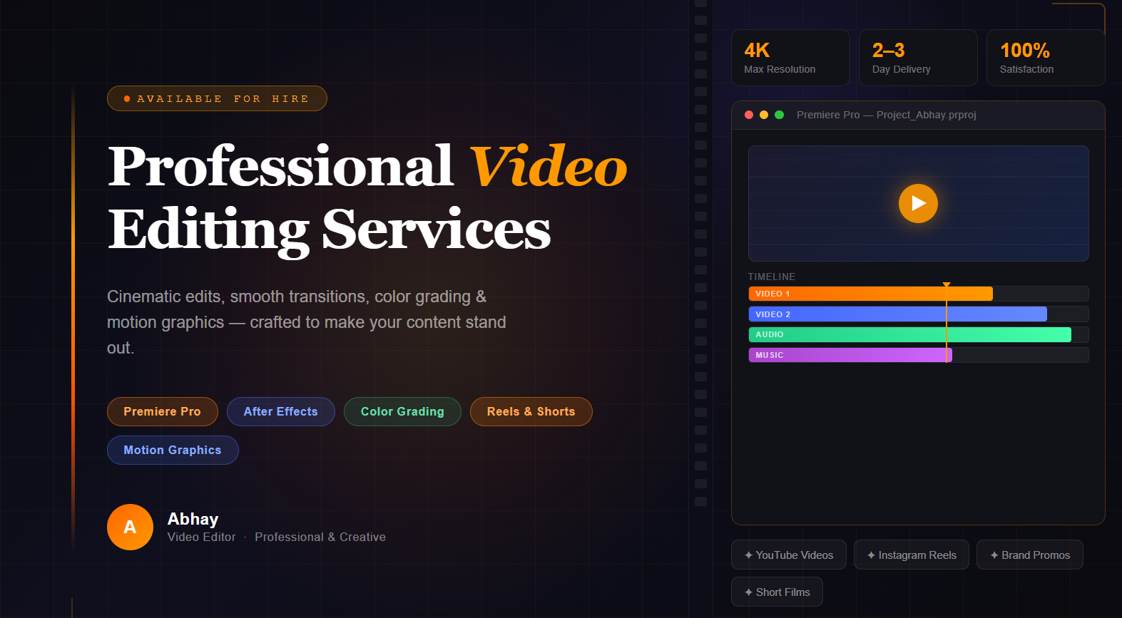 Hi, I'm Abhay I am a professional video editor specializing in high-growth social media content. I help creators and brands turn raw footage into viral-ready Reels, YouTube Shorts, . My editing style focuses on fast-paced cuts, trending transitions, dynamic captions, and sound design that keeps viewers hooked until the very last second. If you want to increase your watch time and grow your audience with professional, eye-catching videos, let’s work together to make your content stand out!