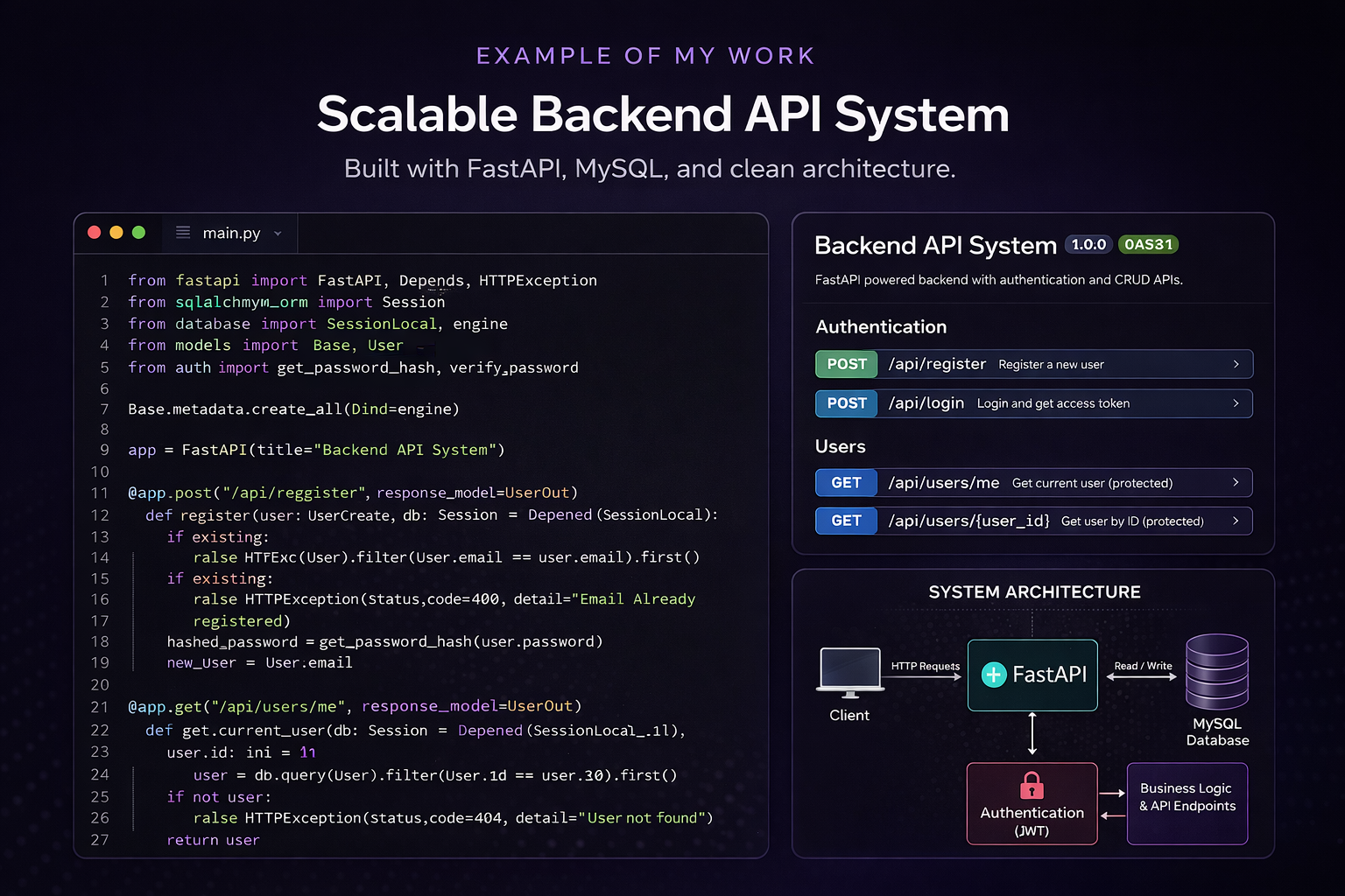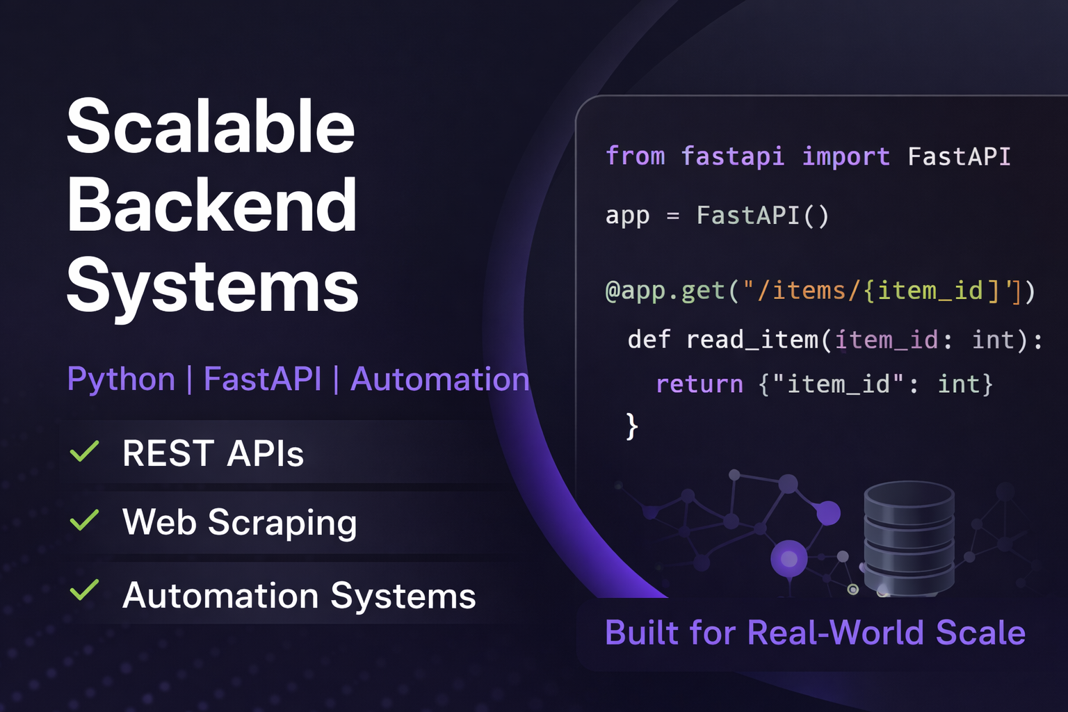 I build backend systems that actually work. Using Python and FastAPI, I create production-ready APIs, web scraping tools, and automation systems that are clean, scalable, and built for real-world usage.