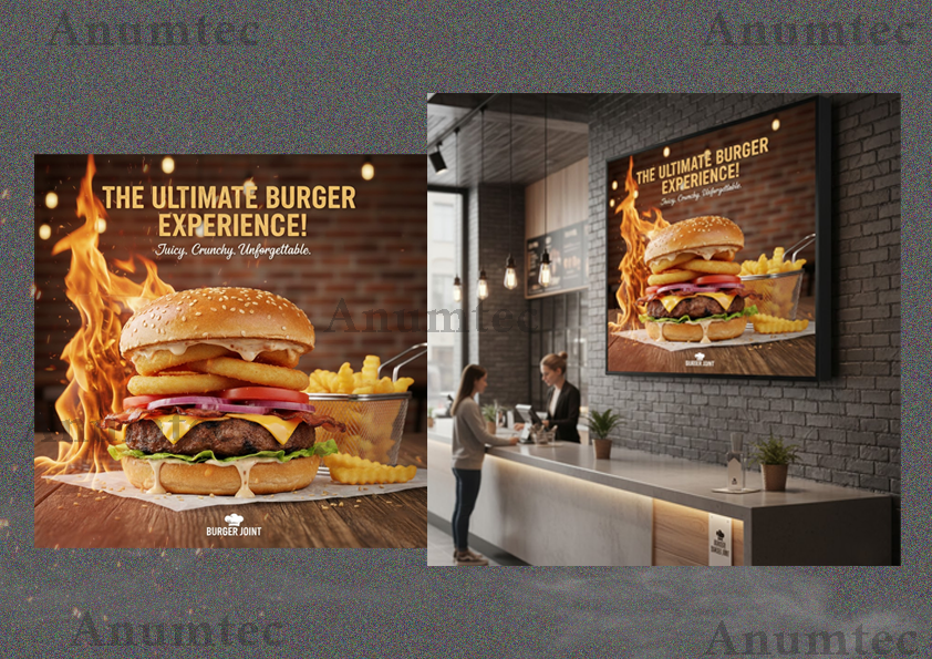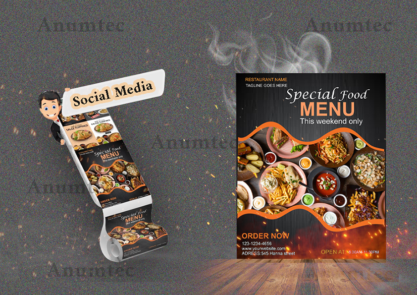 To start, I’ll need your logo, text content (e.g., restaurant name, menu items, offers), preferred colors, size requirements, and any images or design ideas you have in mind. If you’re unsure, I can guide you through it!