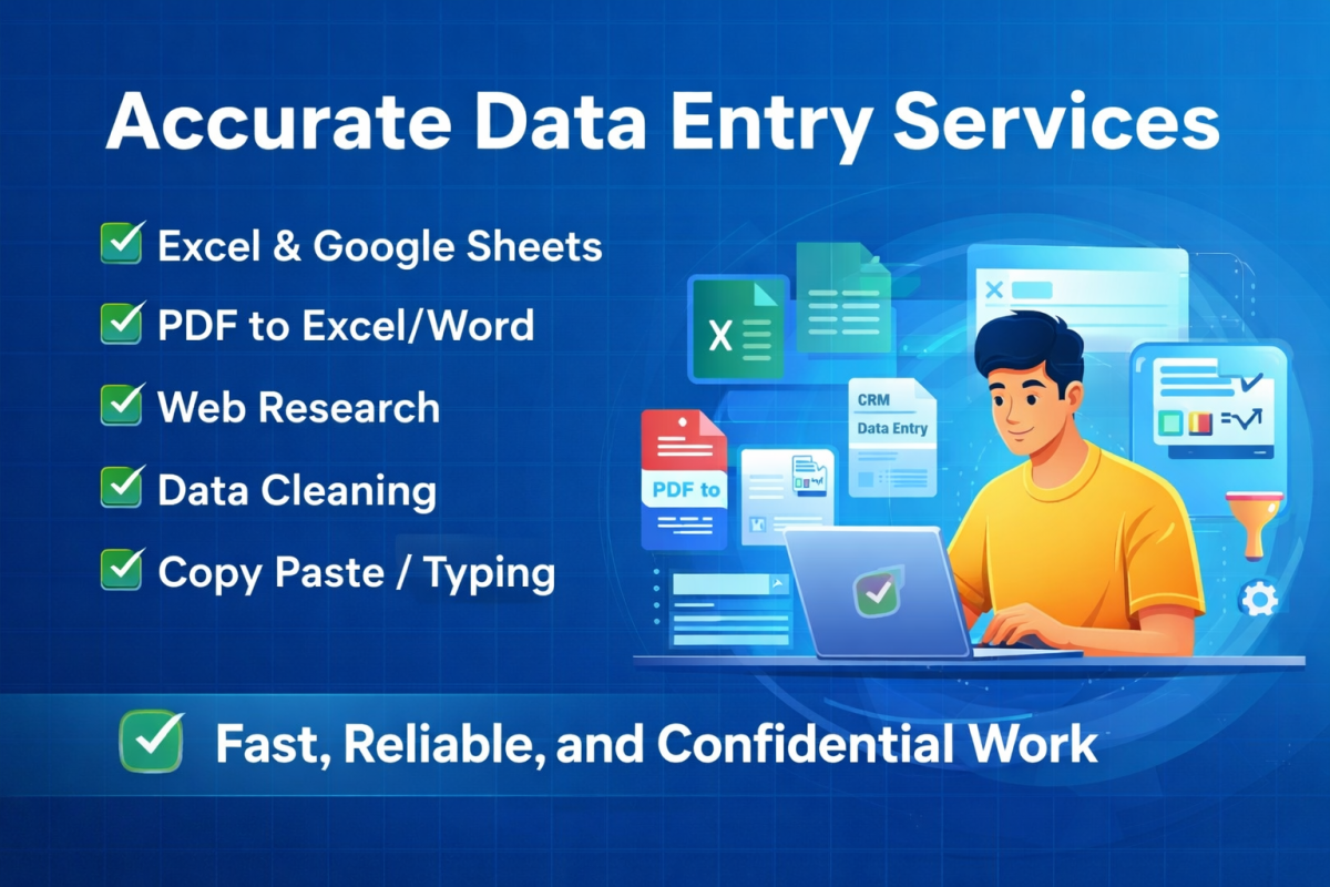 I am a professional data entry and virtual assistant specializing in Excel and Google Sheets. I provide accurate typing, data formatting, PDF to Excel/Word conversion, web research, and data collection. I focus on quality, confidentiality, and on-time delivery. My goal is to help clients save time with clean, well-organized, and error-free work.