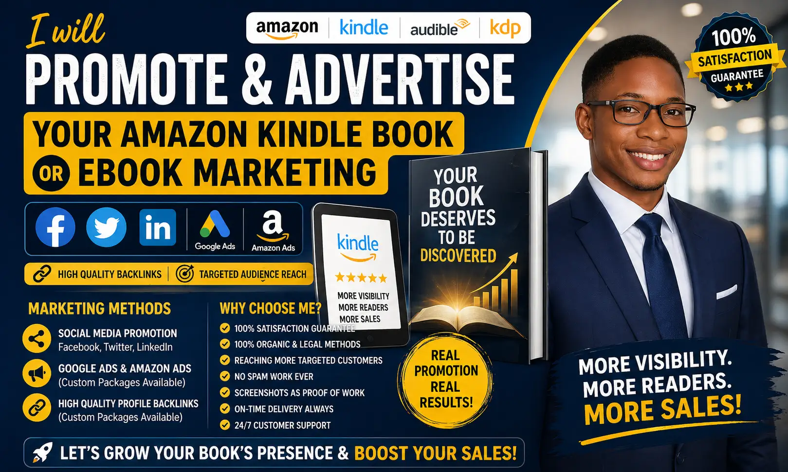 I know the best marketing strategies perfectly suited for your book website promotion or item marketing. I will promote your book across Facebook, LinkedIn, and Twitter, supported by High Quality Backlinks and Google Ads. Whether you have an Amazon book, Kindle book, audiobook, children's book, novel, romance, poetry, Christian, or eBook — I've got you covered. All work is done manually on social platforms and is 100% safe and trusted.