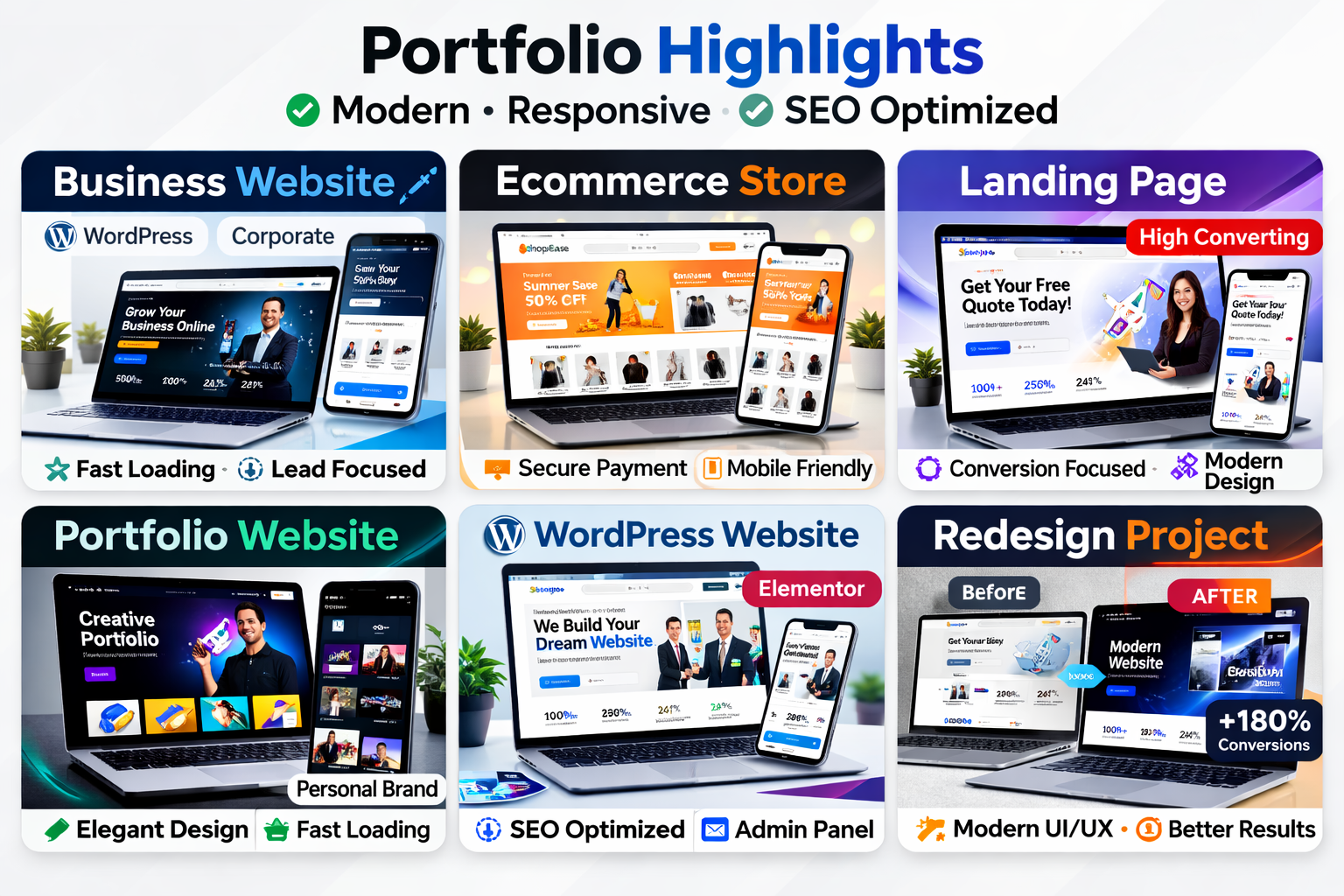 I will design and develop a professional, responsive, and high-performing website tailored specifically to your business goals. Whether you need a corporate business website, personal portfolio, landing page, blog, or a complete eCommerce store, I focus on delivering clean design, smooth functionality, and a user-friendly experience that represents your brand perfectly.