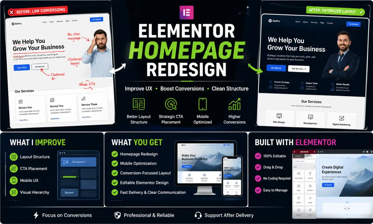 Basic Elementor homepage redesign with improved layout and mobile optimization.