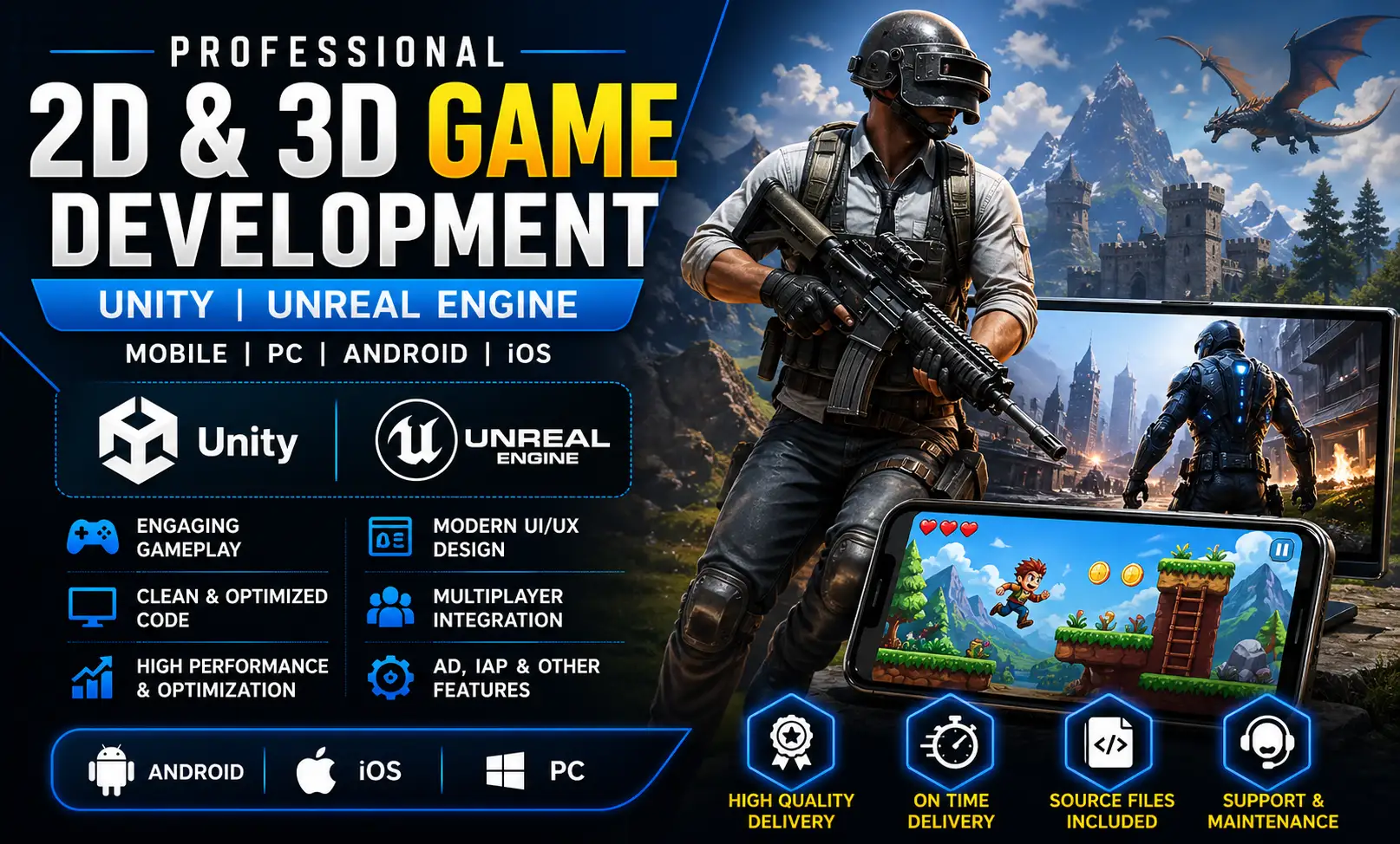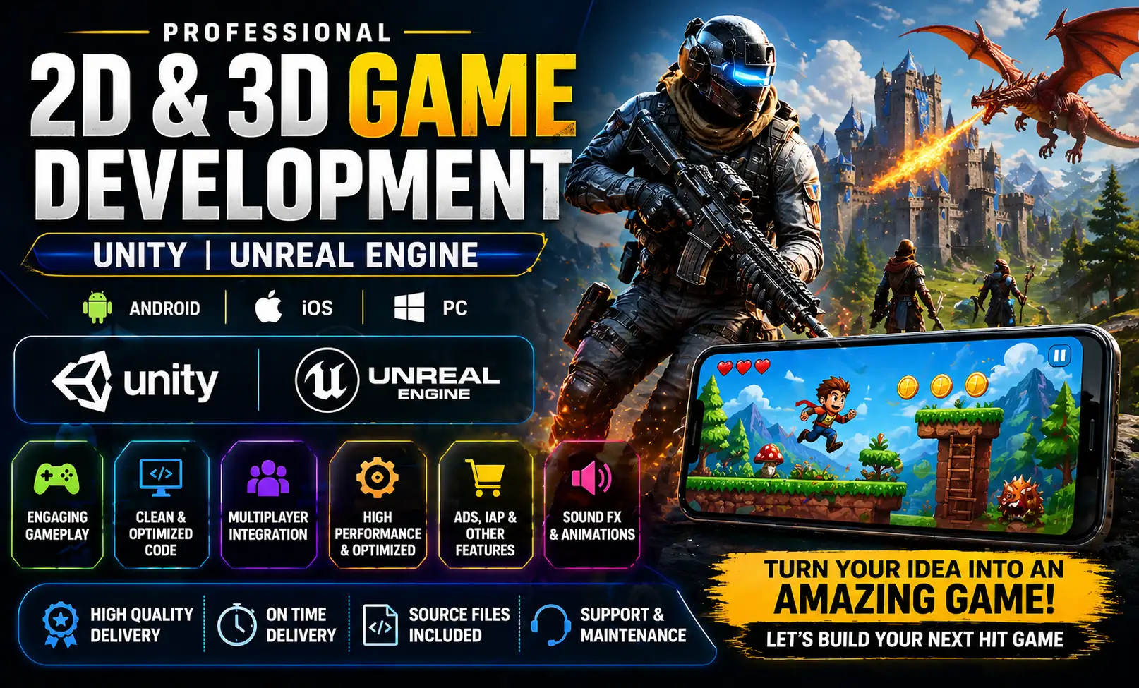 I will develop a professional 2D or 3D game tailored to your requirements using Unity or Unreal Engine. My service covers the full development process, from concept to a functional and optimized game ready for deployment.