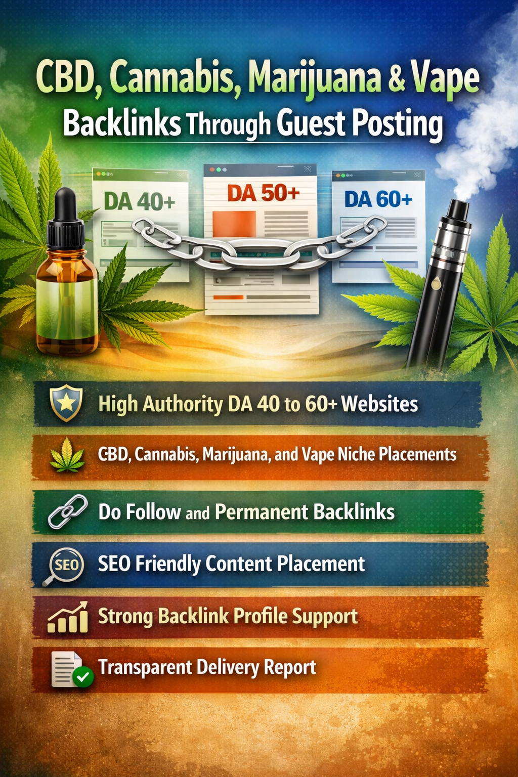CBD, cannabis, marijuana, and vape websites face fierce competition and limited link options. Our service builds authority through guest posts on niche-relevant, industry-friendly sites. We secure real guest posts on high-authority DA 40–60+ websites with permanent, do-follow backlinks to boost SEO authority, visibility, and keyword trust.