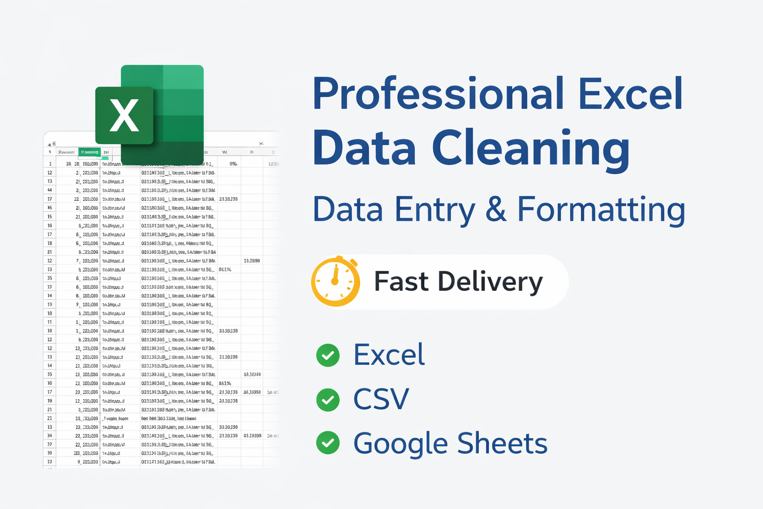 Working with large datasets can be time-consuming and confusing. My goal is to help you save time by transforming messy or unstructured data into a clean, organized, and well-formatted spreadsheet. I focus on accuracy, consistency, and clear formatting to ensure your data is useful for analysis, reporting, and business decisions.