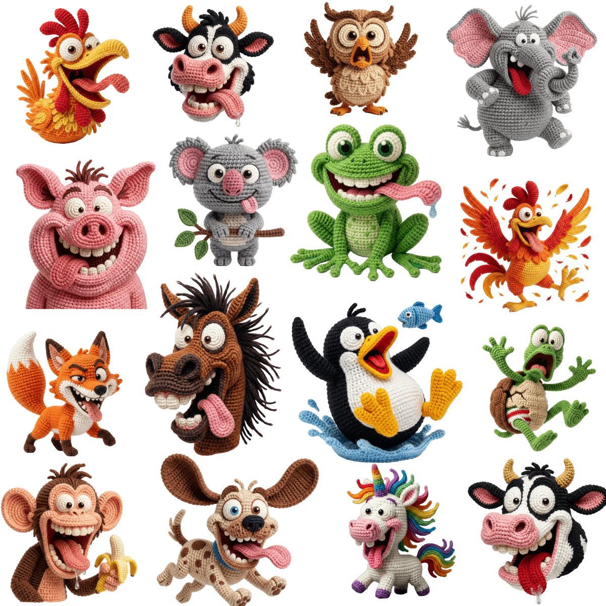 Add a touch of whimsy and texture to your designs with this "Funny Crochet Animals" bundle! This collection features 16 high-quality, hyper-realistic character illustrations that look exactly like handmade knitted or crochet toys. Each animal is bursting with personality, featuring crazy, joyful expressions that are sure to bring a smile to anyone's face.