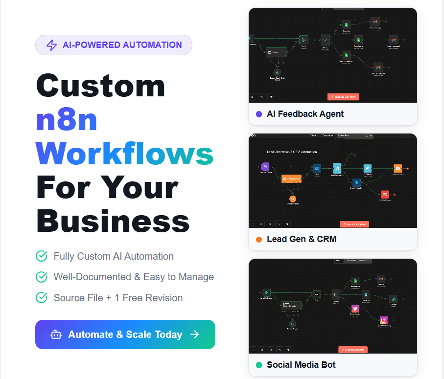 I will design a custom AI automation tailored specifically to your business using n8n, a powerful workflow automation tool. This automation helps streamline your business processes by reducing repetitive manual tasks, saving valuable time, and improving overall efficiency. By automating workflows, you can focus on more important aspects of your business while ensuring that routine tasks are handled seamlessly. Whether it’s email handling, form submissions, or connecting multiple tools and platforms, this service ensures your operations run smoothly and consistently.