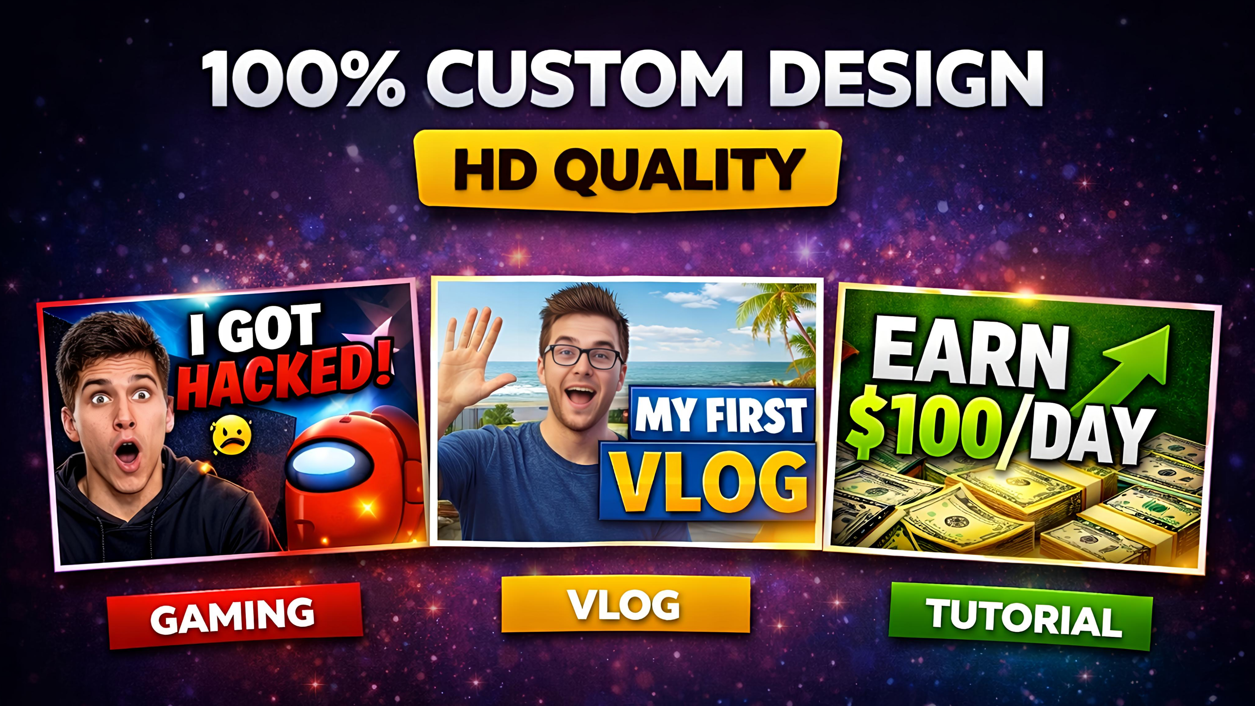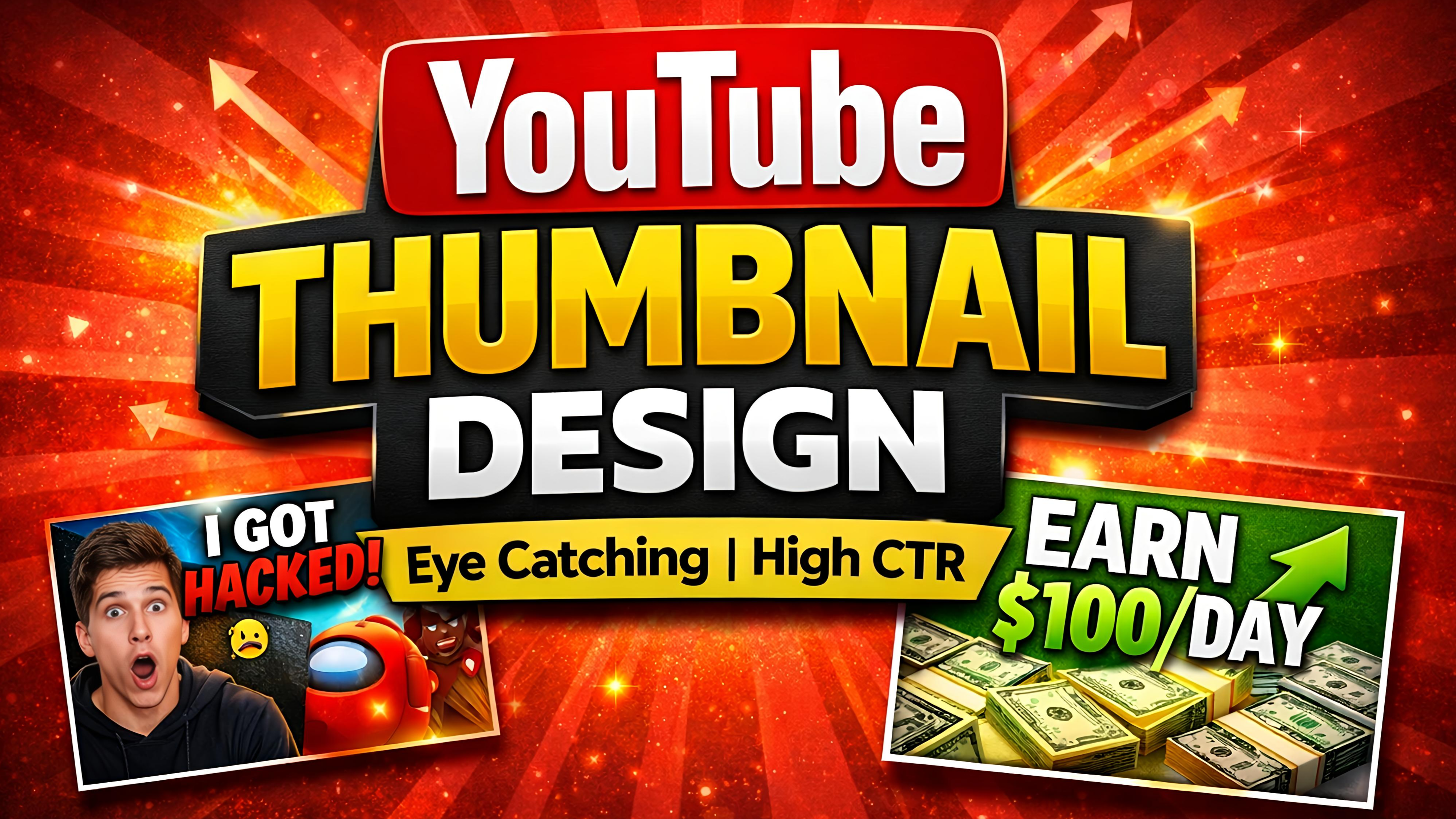 I design thumbnails for all types of YouTube content including Gaming, Vlogs, Education, Tutorials, Reaction videos, Tech, Lifestyle, Business and many more niches. Every thumbnail I create is unique, modern and customized according to your video topic, target audience and channel branding. I focus on strong visual hierarchy, bold text, engaging images and clean layouts so your thumbnail looks professional on both desktop and mobile devices.