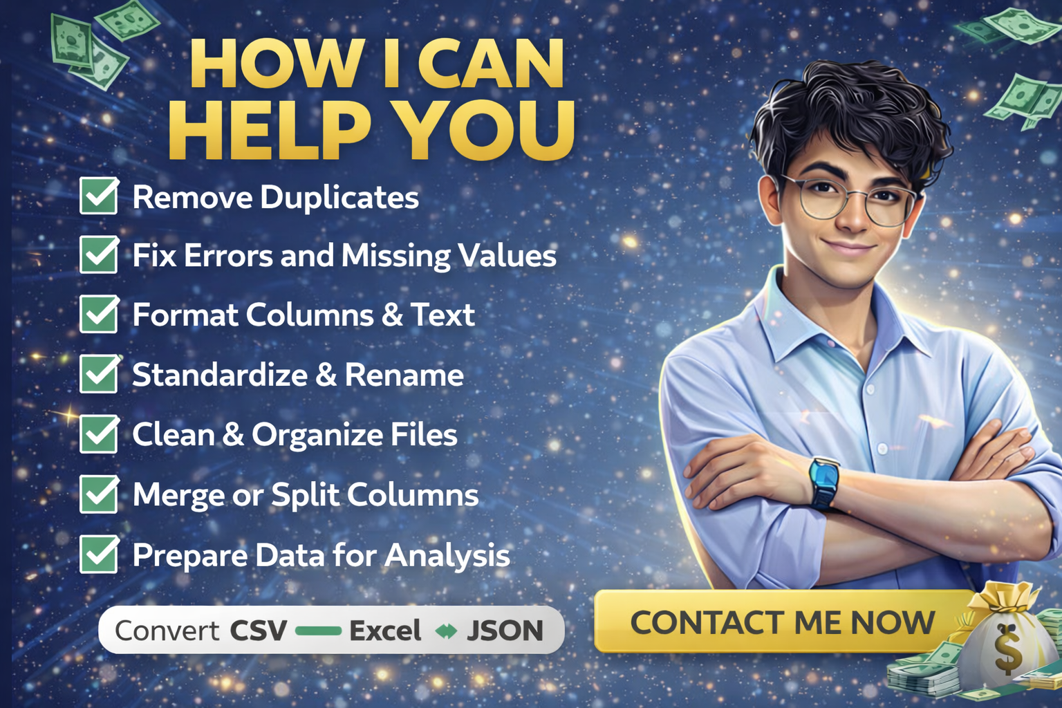 I help businesses clean, organize, and prepare messy data for analysis. Skilled in Excel, Python (Pandas), SQL, and data preprocessing. I ensure accuracy, consistency, and high-quality datasets for reports, dashboards, and decision-making.
