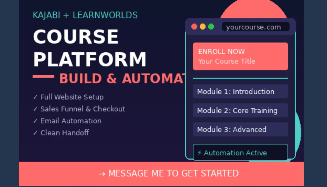 I build Kajabi & LearnWorlds platforms that turn visitors into students. No more wrestling with tech just clean setups, optimized checkouts, and automations that enroll while you teach. What I help with: Full platform setup and branding Sales pages and checkout optimization Automated email sequences and student onboarding Clean handoffs so you own the process Message me your project and I'll reply with next steps.