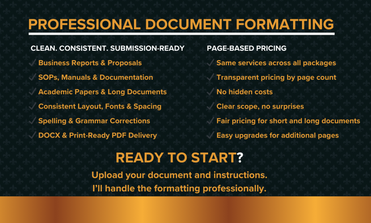 By handling the technical and visual aspects of document formatting, I save you valuable time and eliminate frustration. You receive a flawless, professional document that strengthens your credibility, impresses stakeholders, and supports effective communication.
