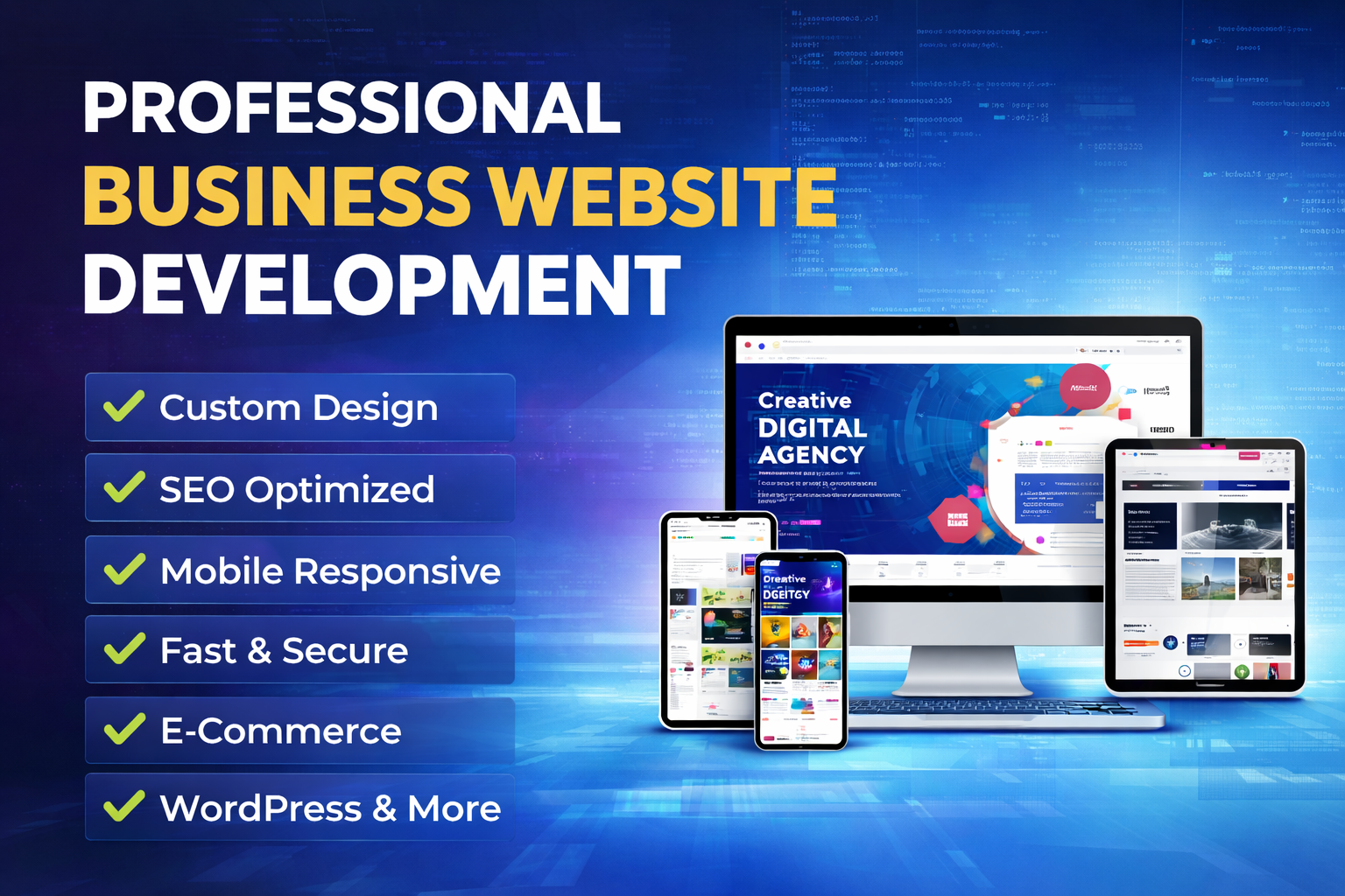 I work with modern technologies including React Nodejs PHP Laravel WordPress and MySQL. Whether you need a corporate website a business website an e commerce platform or a custom web application I will deliver a solution fully tailored to your requirements.