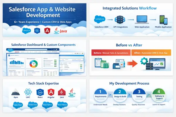 I help businesses automate processes, improve data visibility, and build user-friendly applications using Salesforce Admin configuration, Apex, Lightning Web Components (LWC), Aura, and complex integrations with third-party systems. Alongside Salesforce, I bring strong full-stack expertise using modern technologies such as React, React Native, Angular, and Java, enabling me to deliver complete web and mobile applications that integrate seamlessly with Salesforce.