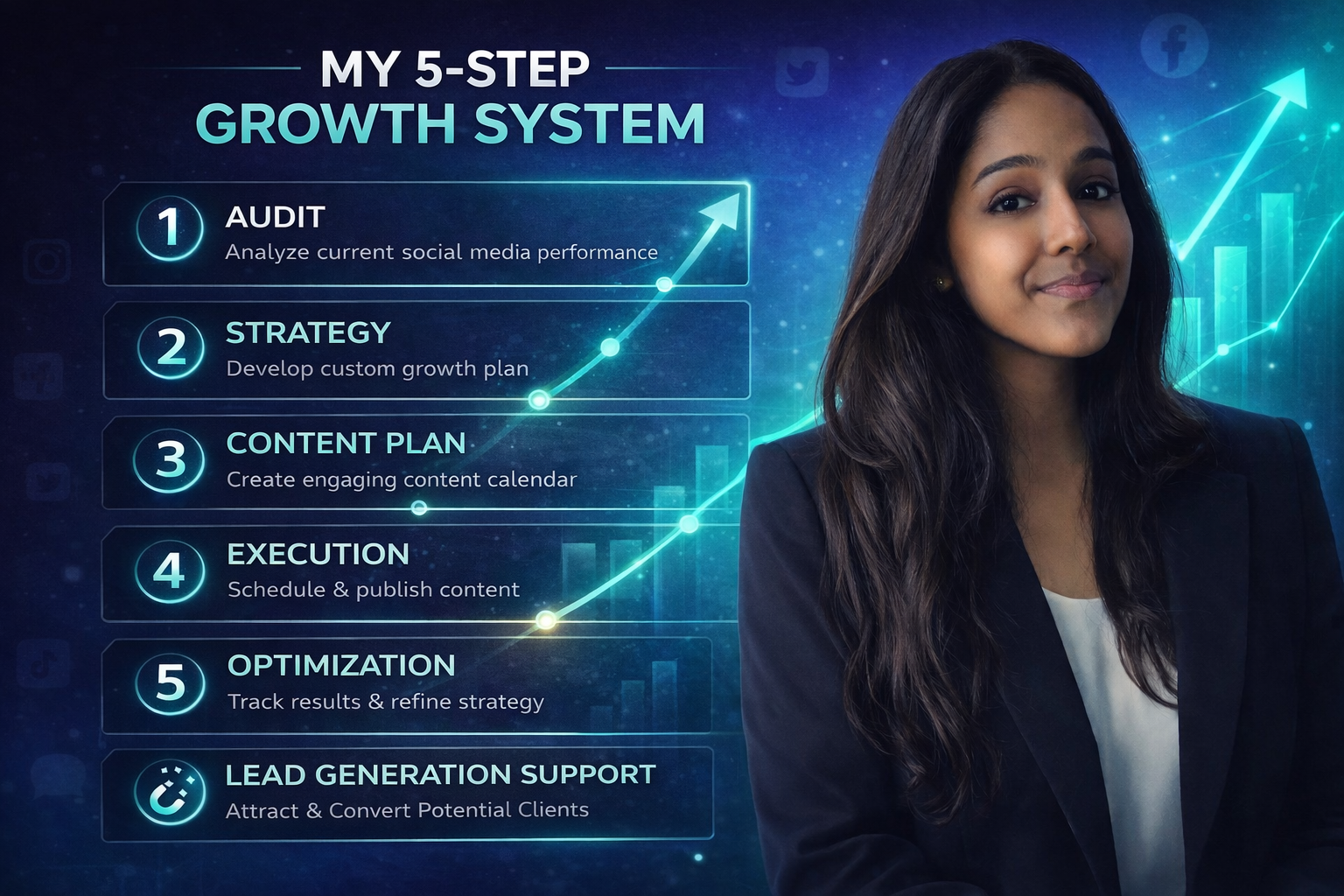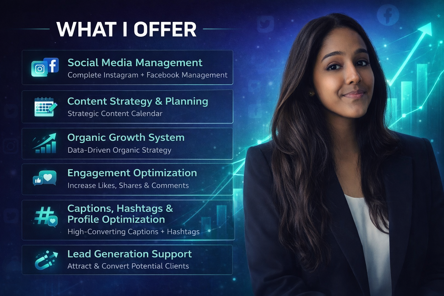 I provide AI-powered social media growth solutions designed to help businesses build authority, increase engagement, and generate consistent results. My approach is strategic, data-driven, and tailored to your niche and target audience.