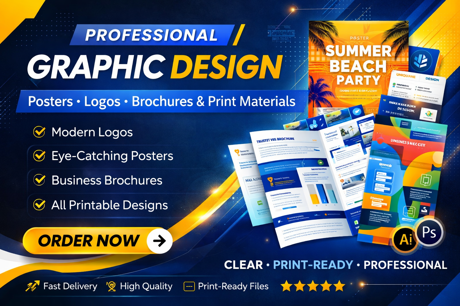 Looking for professional and eye-catching graphic designs that make your brand stand out? Whether you need a modern logo, promotional poster, business brochure, or any type of print-ready design, I can help you create visuals that leave a strong impression.