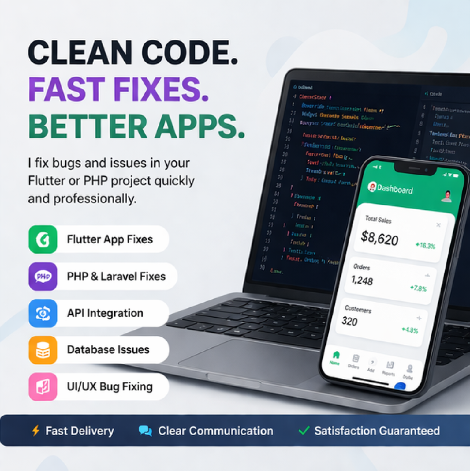 Services I offer include fixing Flutter app crashes, resolving UI and layout issues, correcting PHP and Laravel errors, debugging API integration problems, and solving database-related issues. I can also fix login, registration, and payment-related errors to improve overall functionality.