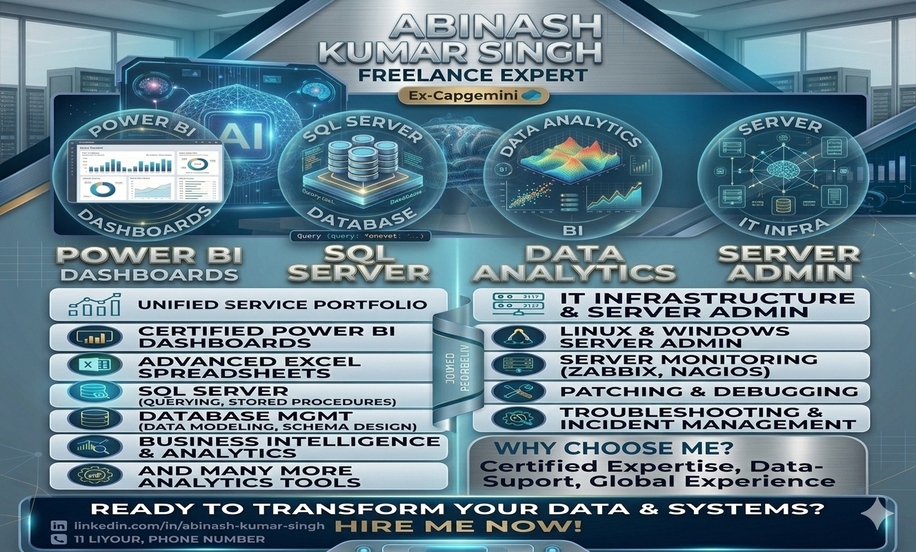 Data is only as good as the systems supporting it. As a Freelance Expert with Ex-Capgemini experience, I specialize in the full lifecycle of IT health—from Advanced Excel and SQL data modeling to Patching, Debugging, and Incident Management. My Core Tech Stack: Analytics: Power BI, SQL Server, Business Intelligence. Infrastructure: Linux/Windows Server Admin, Zabbix, Nagios. Support: Troubleshooting & 24/7 Incident Response.