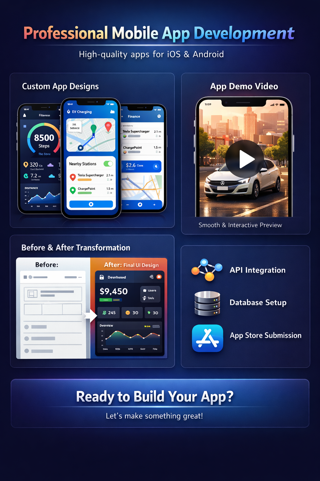 My expertise includes mobile app development for both iOS and Android, backend setup, API integrations, database structuring, and workflow automation. I also ensure your app is built in a way that allows future scalability, so you’re not stuck when your user base grows.