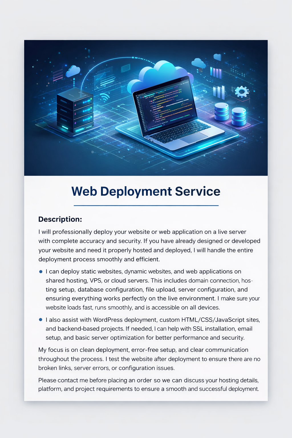 Please contact me before placing an order so we can discuss your hosting details, platform, and project requirements to ensure a smooth and successful deployment. I will professionally deploy your website or web application on a live server with complete accuracy and security. If you have already designed or developed your website and need it properly hosted and deployed, I will handle the entire deployment process smoothly and efficiently.