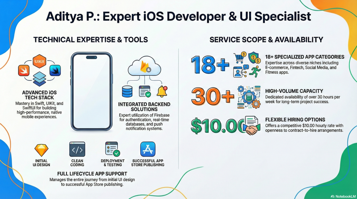 I am Aditya Pandya an experienced iOS app developer with strong skills in Swift Xcode and mobile application development I build reliable user friendly iOS apps for businesses and individuals My focus is on clean UI smooth performance and quality code I provide clear communication timely delivery and support throughout the development process I work on property e commerce and chat based applications and help clients from idea to App Store submission