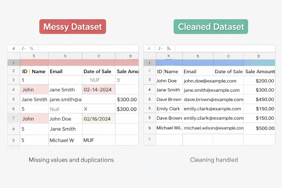 Clean small datasets by removing duplicates and fixing basic formatting issues.