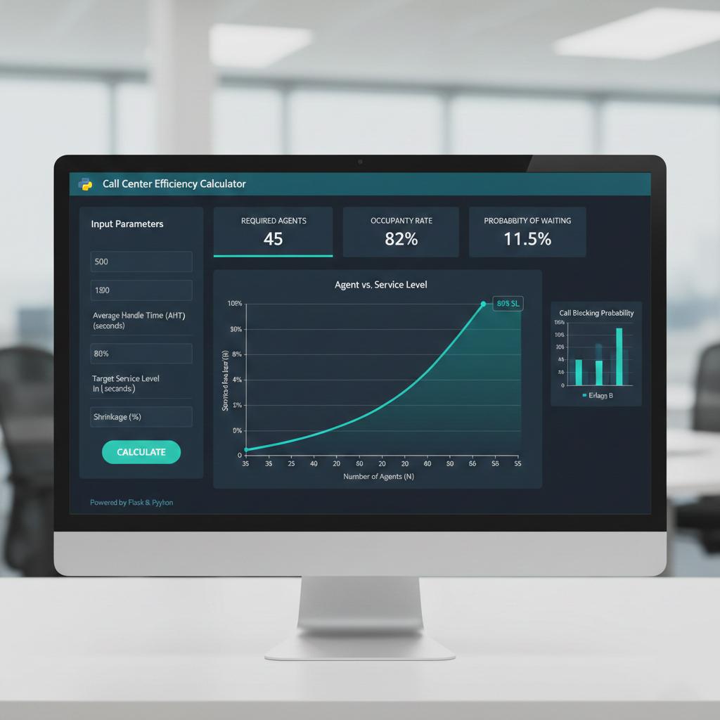 Call Center Efficiency (Erlang C): Calculate the exact number of agents needed to meet your Service Level (SL) and Average Speed of Answer (ASA) targets, accounting for shrinkage and occupancy. Full dashboard, Graph/Chart visualizations, CSV exports