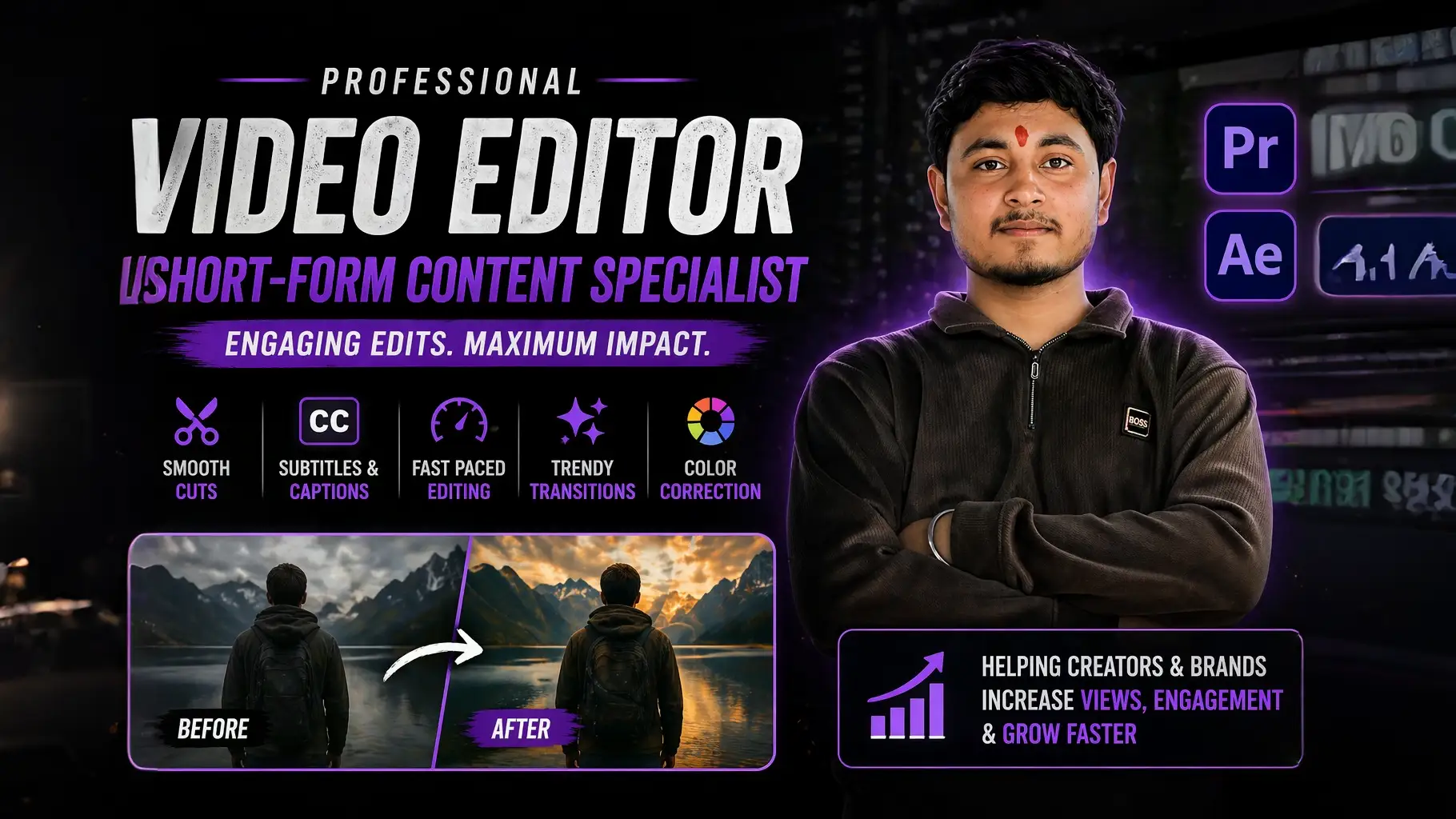I edit videos using smooth cuts, fast-paced style, clean transitions, and proper timing to match trending formats. I also add engaging captions and subtitles that make videos more interesting and easy to understand. My color grading and visual adjustments help improve the overall look and feel of the content.