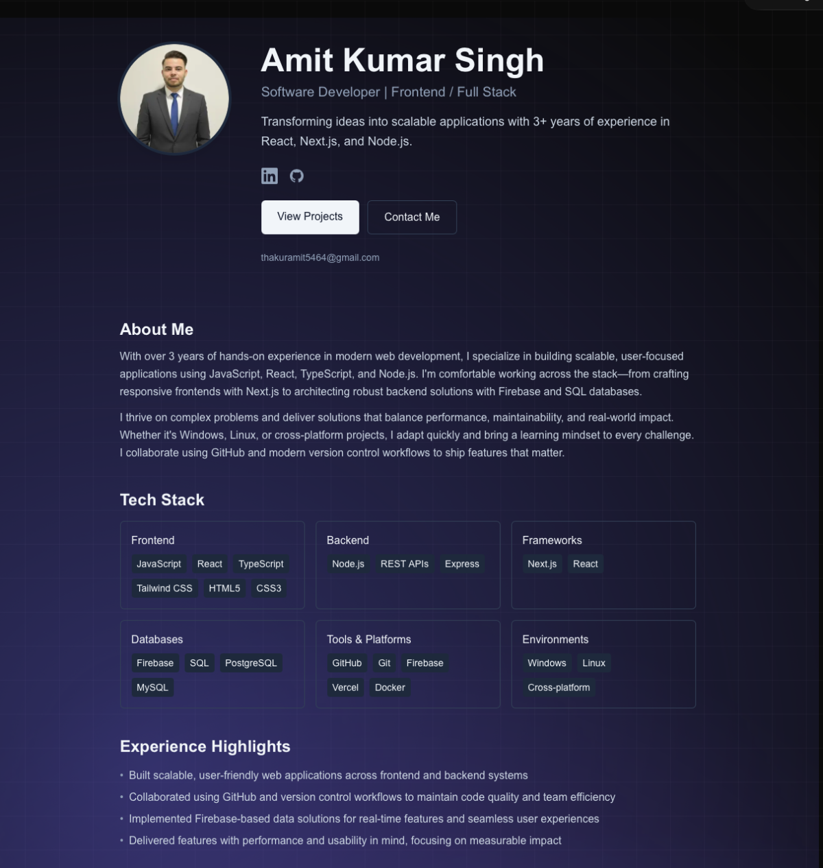 I am a software developer with over three years of professional experience building modern, scalable, and user-friendly web applications. I specialize in JavaScript, TypeScript, React, and Nodejs, and I have a strong foundation in both front-end and back-end development. I enjoy working across the full development lifecycle, from understanding requirements and designing solutions to implementation, testing, and deployment.