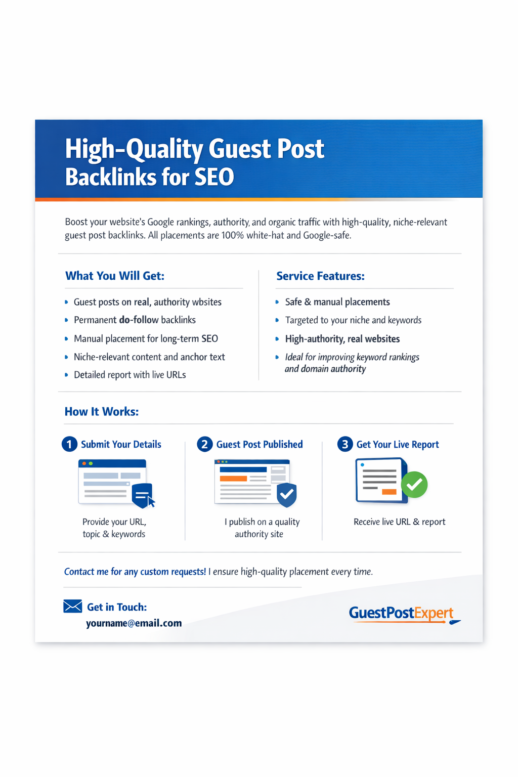 I will provide high-quality, niche-relevant guest post backlinks that help improve your website’s search engine rankings, domain authority, and overall online visibility. This service is designed for businesses, bloggers, and website owners who want safe, long-term SEO growth through ethical and effective link building.