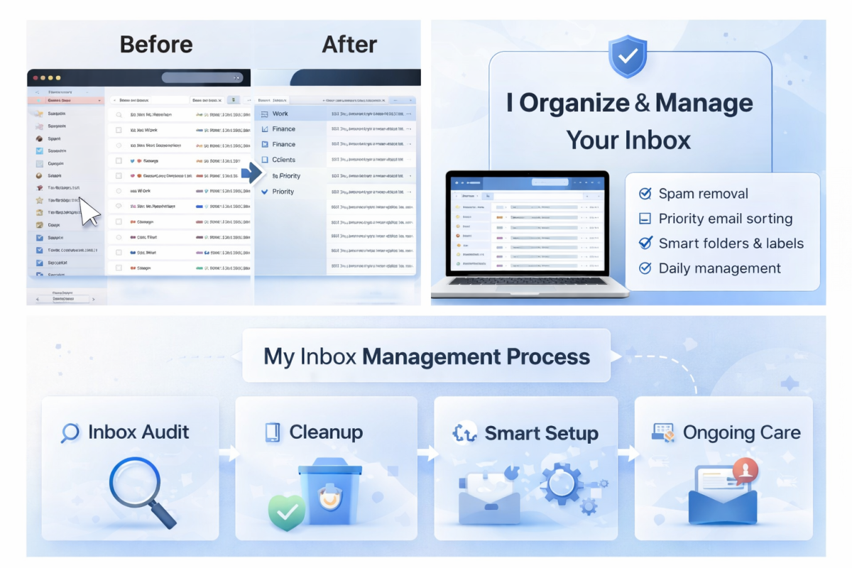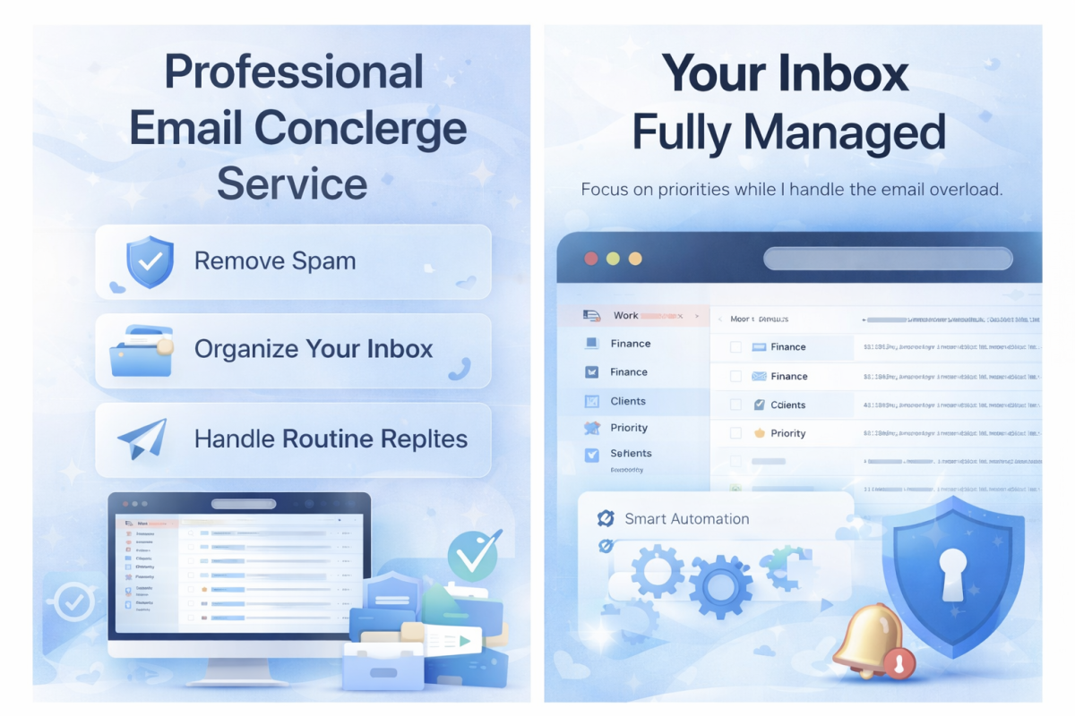 Is your inbox overflowing with unread emails, spam, and missed important messages? I help busy professionals, entrepreneurs, and small businesses regain control of their inbox and transform chaos into a clean, organized, and stress-free system that actually works for them.