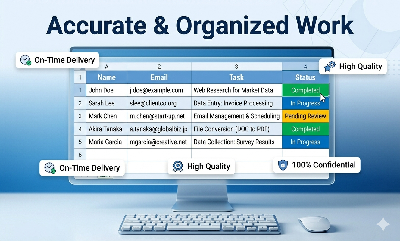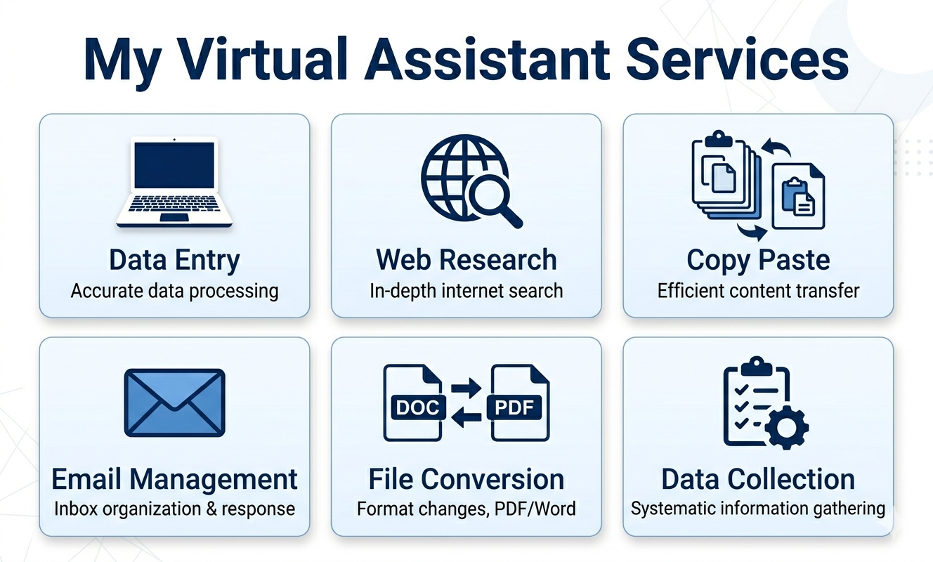I can handle data entry, web research, copy paste, email management, file organization, and admin support tasks. I also provide basic lead generation, LinkedIn research, and data cleaning services.