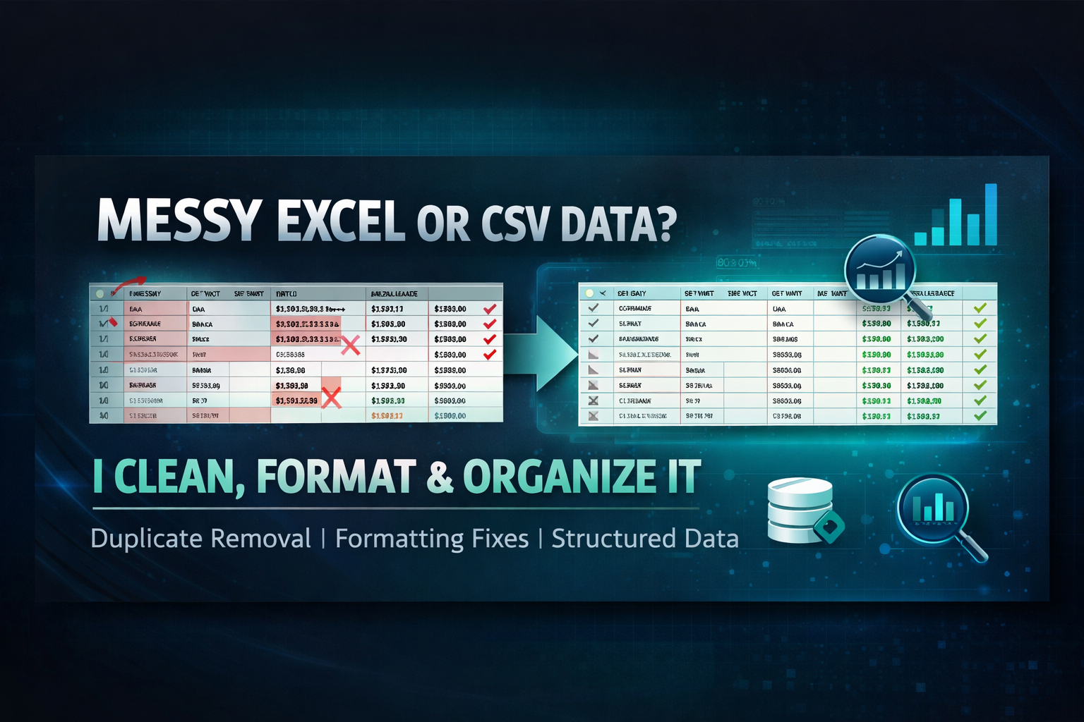 I help businesses clean, organize, and structure messy Excel and CSV data. Skilled in data cleaning, duplicate removal, formatting, and spreadsheet organization. I focus on accuracy, consistency, and delivering clean, reliable data ready for reporting or uploads.