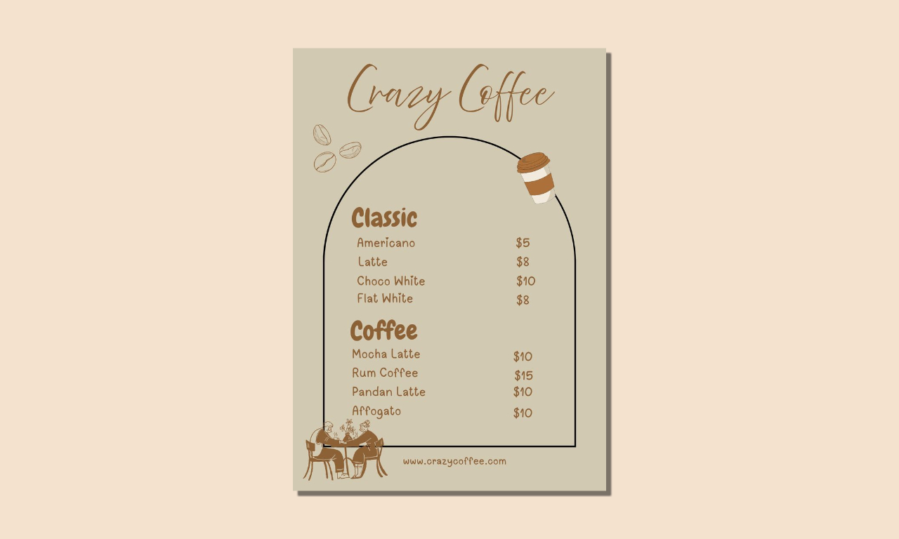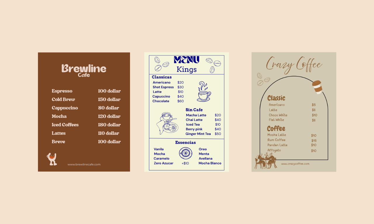 Dine-in menus, cafe menus, menu boards, digital menus, takeaway flyers, table tents, and QR menus.
