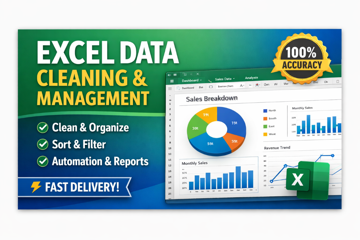 I am a professional Excel Expert specializing in advanced Excel, data cleaning, managing, sorting, and organizing Excel files. I help businesses convert messy data into clean, accurate, and well structured spreadsheets. My expertise includes advanced formulas, pivot tables, dashboards, Excel automation, and Excel based bookkeeping and financial reporting. I ensure accuracy, efficiency, fast delivery, and complete data confidentiality.