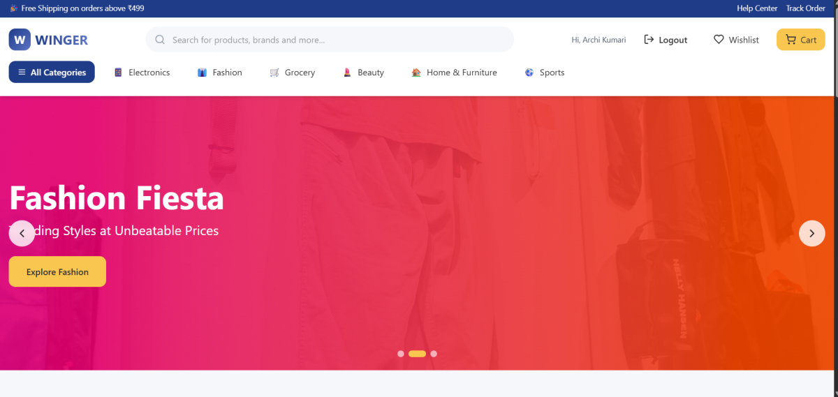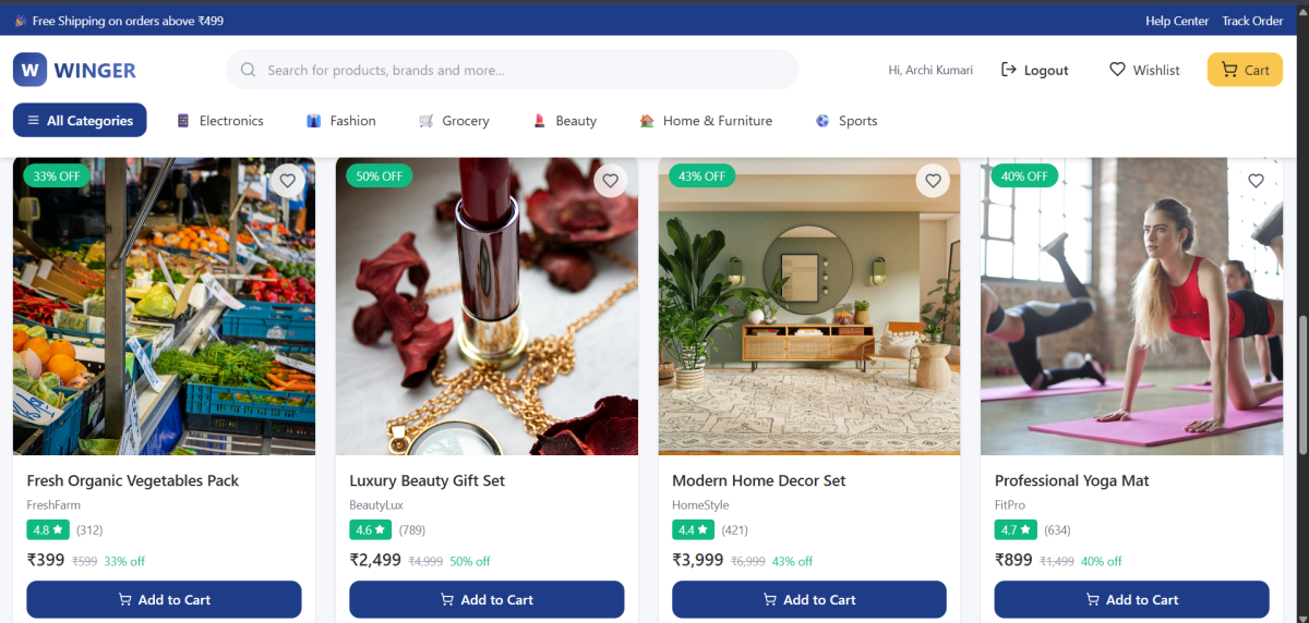The project includes a modern, responsive user interface compatible with desktop and mobile devices. Core frontend deliverables consist of a visually appealing home page, structured product listing pages, category-wise product display, and detailed product view pages showing images, prices, descriptions, and ratings. A search and filtering system allows users to easily find products. The UI emphasizes clarity, accessibility, and smooth navigation across all pages.
