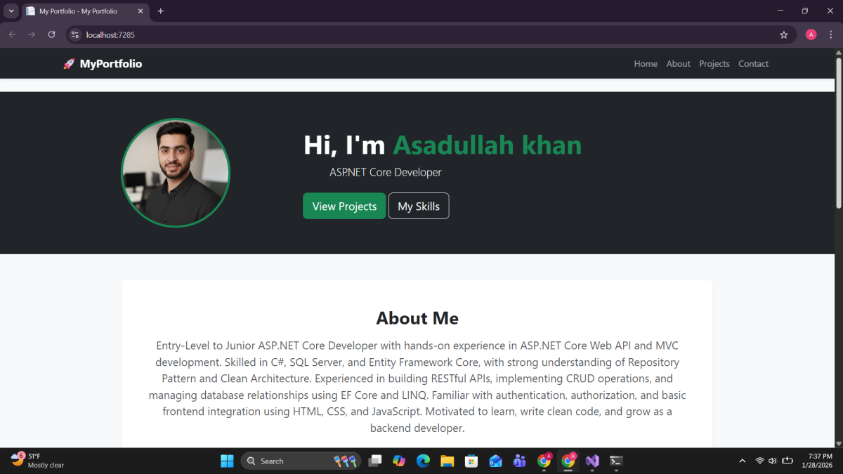 I am an ASP DOT NET Core developer with a strong foundation in Web API and mvc I build clean secure and scalable back end solutions using C sharp Entity Framework and SQL Server I focus on writing well structured code and delivering reliable applications I am eager to learn improve and provide quality work to my clients