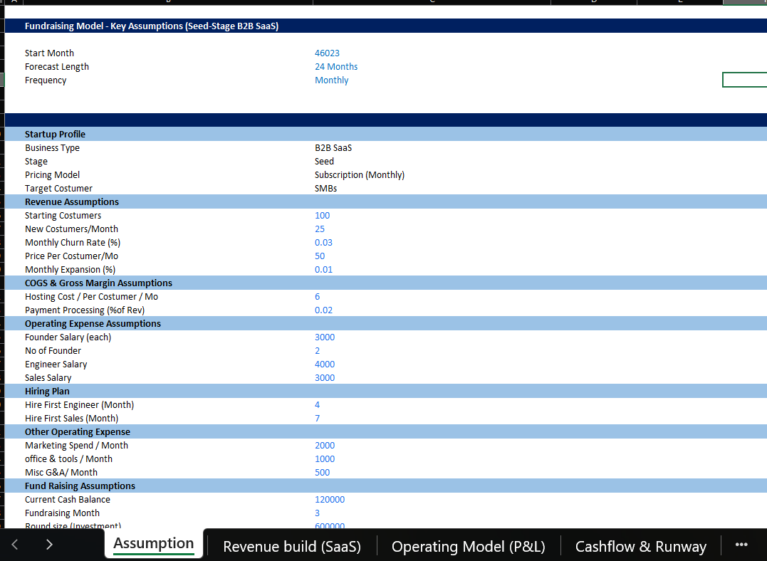My goal isn’t just to create spreadsheets — it’s to help founders understand their numbers, stress-test their strategy, and walk into investor conversations with clarity. A good model should tell your story, highlight your key drivers, and make it easy to answer the questions investors always ask: How fast can you grow? How long is your runway? When do you need to raise again?