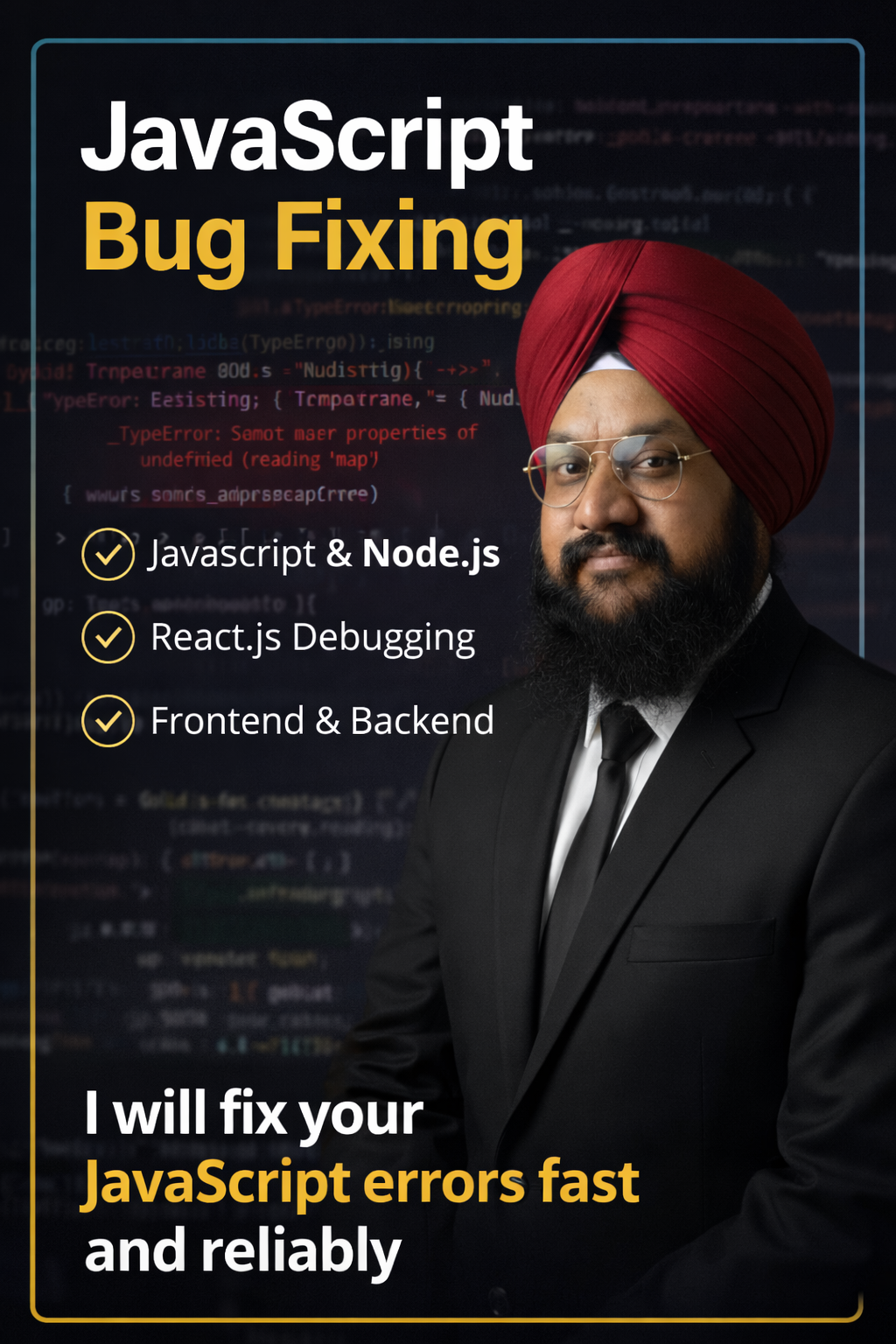 I will fix JavaScript, Node.js, and React.js bugs in frontend or backend code.