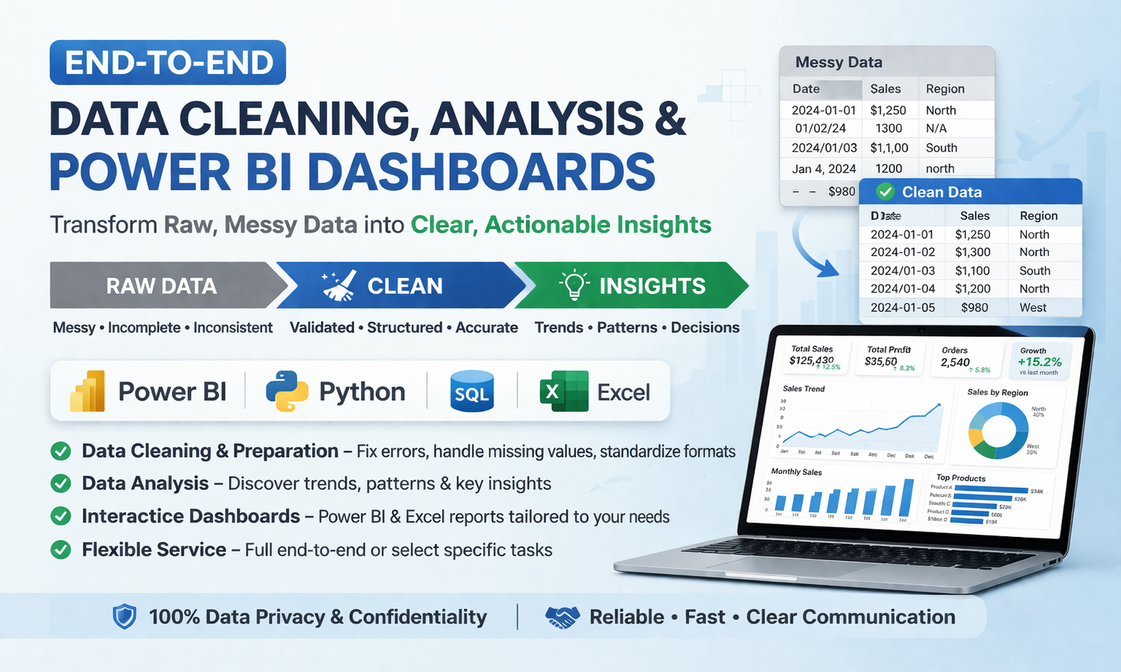 If your data is messy, incomplete, or inconsistent, I will clean and prepare it to ensure accuracy and reliability.