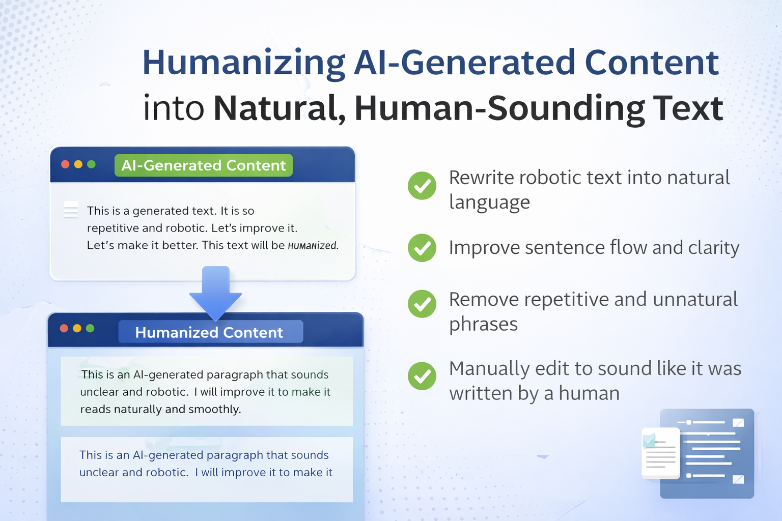 Humanizing AI content means rewriting and editing AI-generated text so it sounds natural, clear, and written by a real person. I remove robotic wording, repetition, and improve readability while keeping the original meaning.