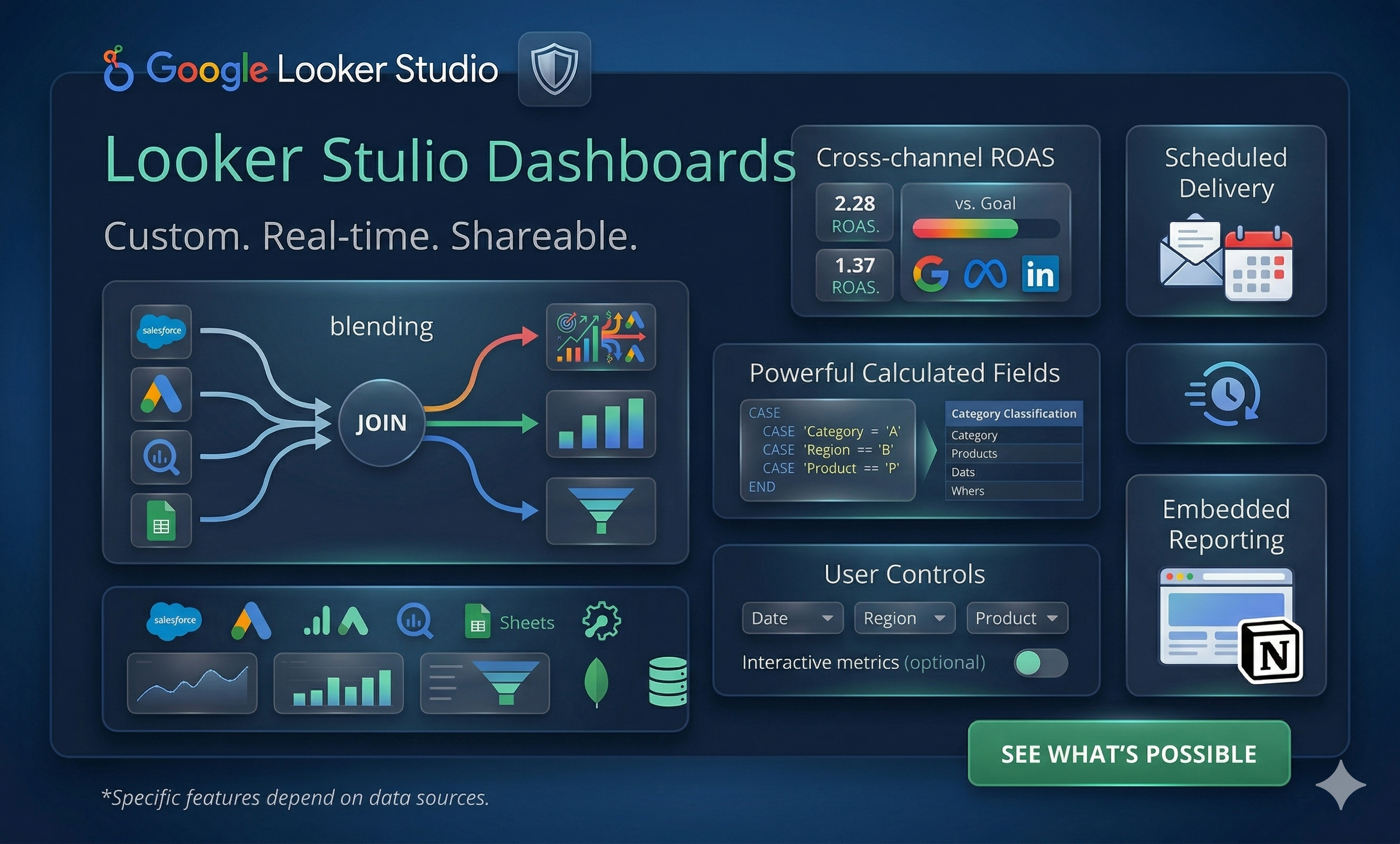 A single Looker Studio dashboard connected to one data source - built around your key metrics.