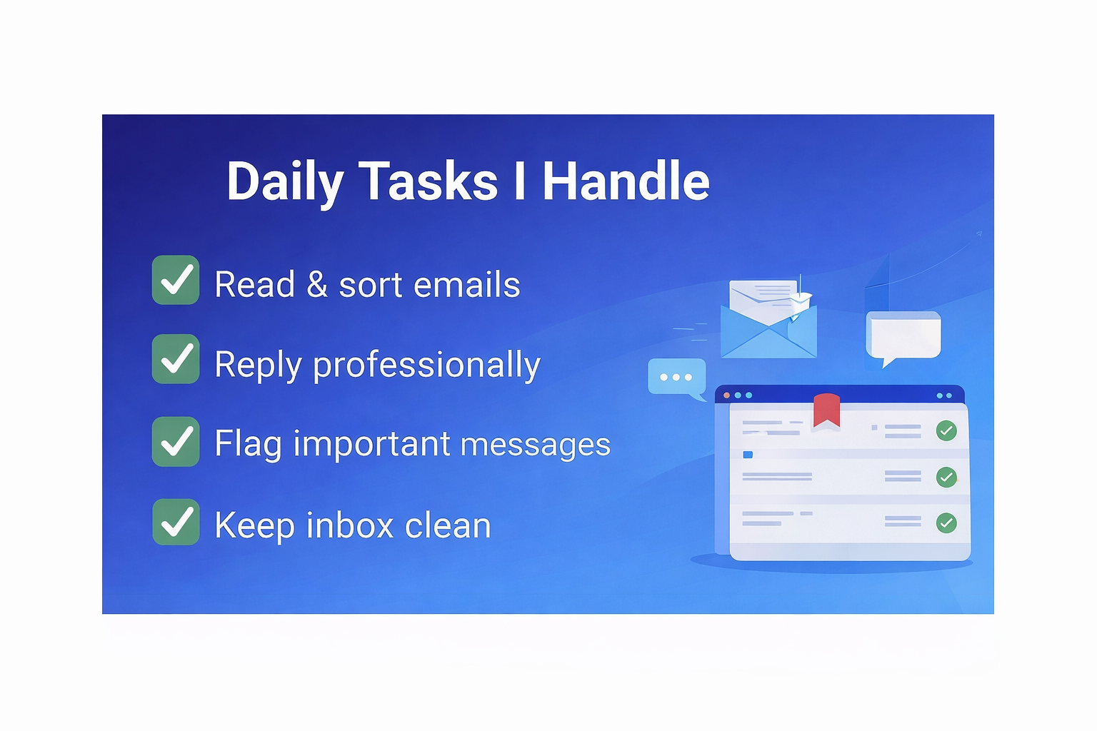 I will efficiently manage your inbox by sorting and organizing emails, labeling important messages, removing spam, and responding based on your instructions. I ensure that every email is clear, polite, and aligned with your business tone. I also identify urgent or priority messages so you never miss important opportunities.