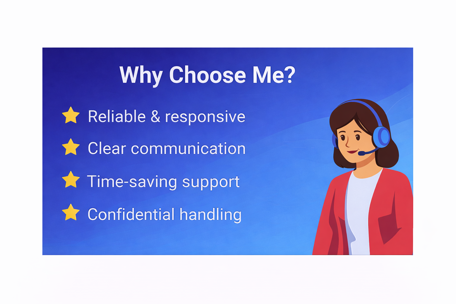 I am detail-oriented, responsible, and committed to maintaining confidentiality and accuracy. I follow instructions carefully and focus on delivering consistent, high-quality support.