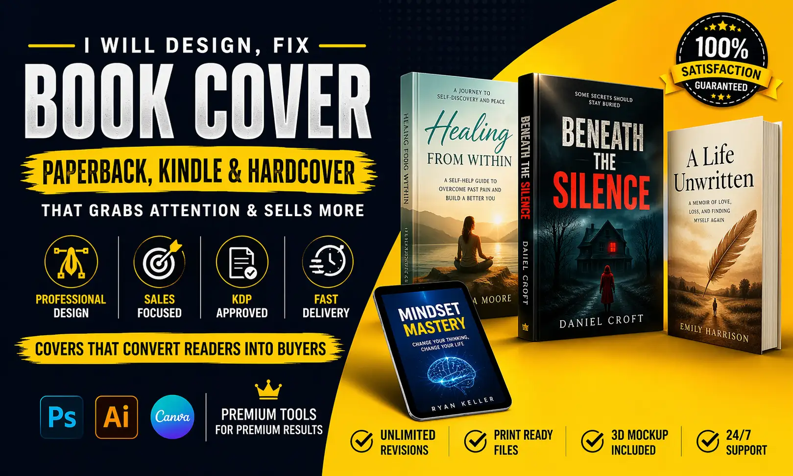 Without a professional book cover design or fix, your paperback, Kindle, or hardcover may look amateurish, reducing clicks, trust, and sales on Amazon KDP and other publishing platforms. First impressions matter and your cover sells your book before anyone reads a word.