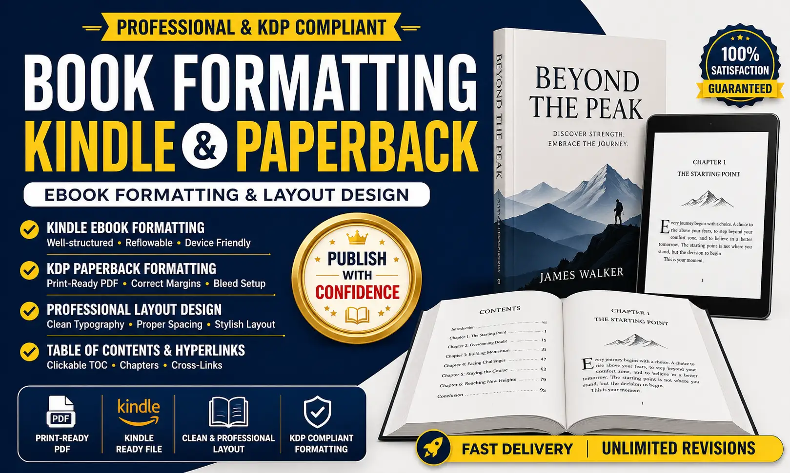 You get KDP-compliant formatting, well-structured chapters, proper spacing, readable typography, clickable table of contents, and a smooth print-ready layout for paperback and hardcover. Your ebook and print files will be fully optimized for Amazon Kindle and global publishing standards.