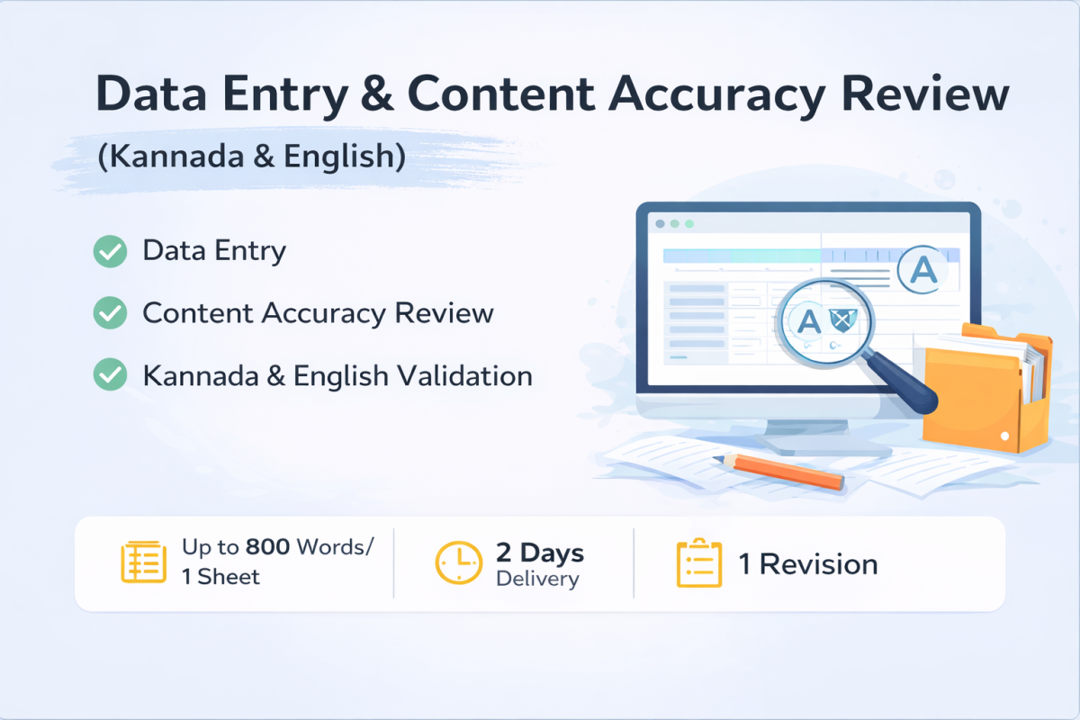 I provide reliable data entry and content accuracy review services in Kannada and English. My work focuses on correctness, consistency, and attention to detail while following clear instructions and quality standards.
