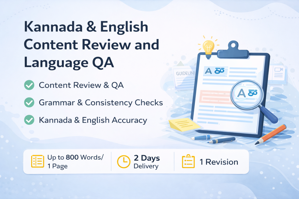 I provide professional content review and language quality assurance (QA) services in Kannada and English. My work focuses on checking content for clarity, correctness, consistency, and guideline compliance without rewriting the original message.