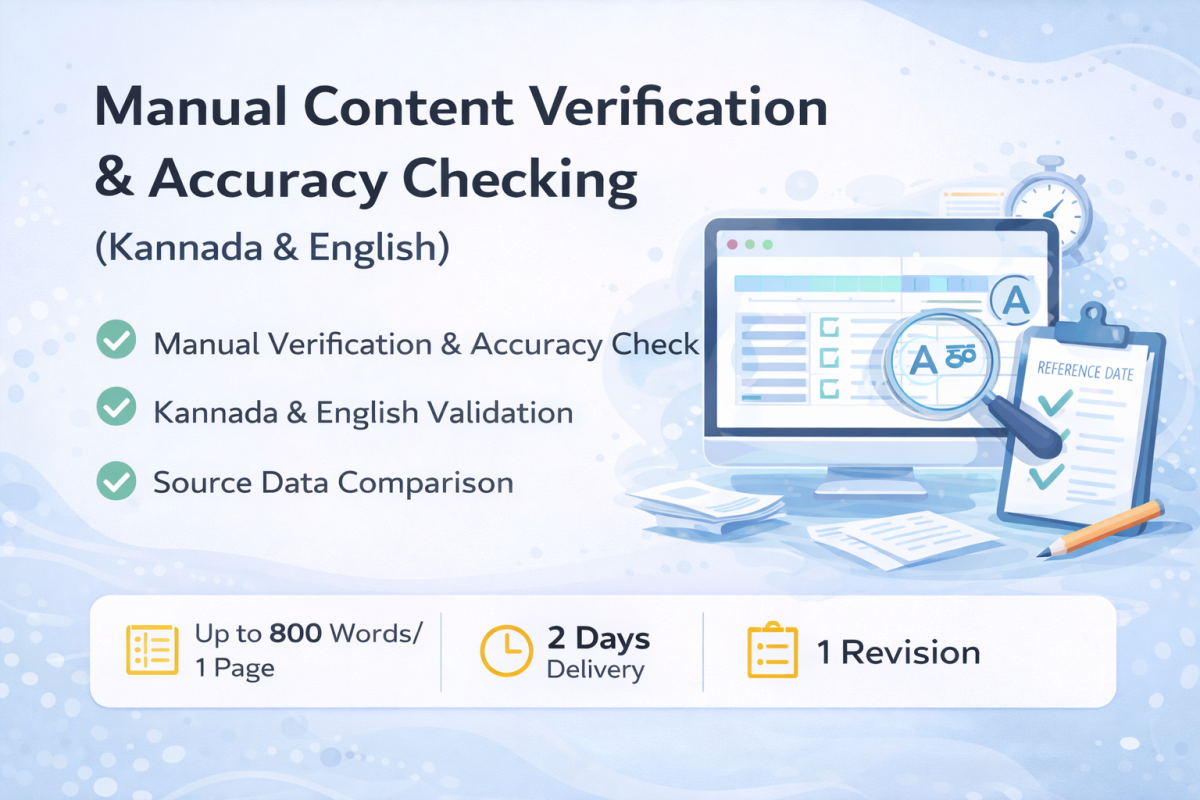 I provide reliable manual content verification and accuracy checking services in Kannada and English. This service focuses on validating content correctness, checking for missing or incorrect information, and ensuring consistency without rewriting or editing the text.