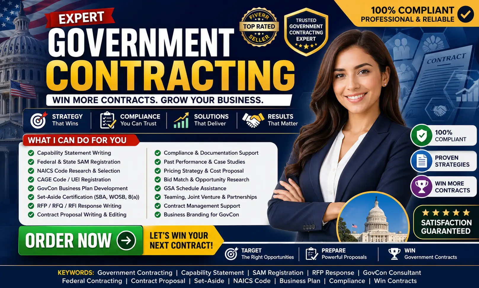 I provide complete support in government contract writing, including RFP/RFQ responses, bid proposals, capability statements, grant proposals, and business documentation tailored for success. Every document is structured to meet compliance standards and improve your chances of winning contracts.